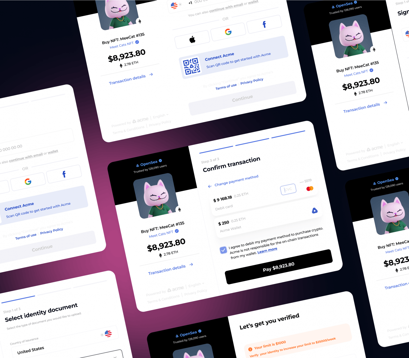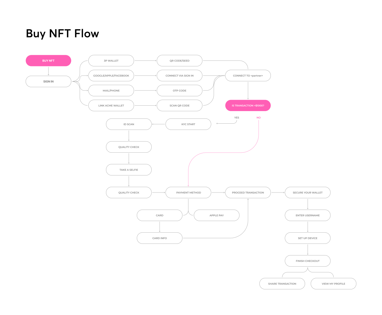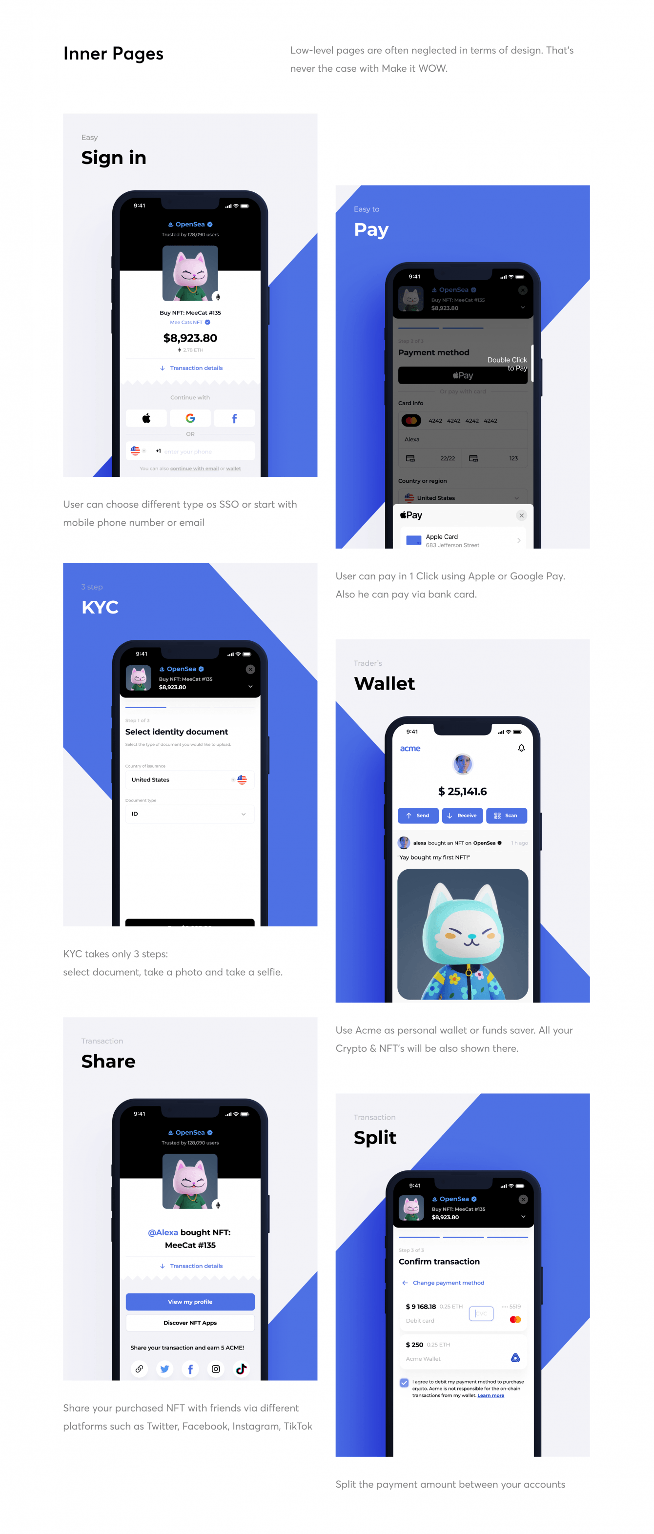 — Разработали подробный User Flow, чтобы пользователи приложения легко могли выполнить и поделиться онлайн-транзакцией (покупка NFT, размещение NFT на продажу, создание NFT), пройти KYC верифиакцию и купить необходимую криптовалюту