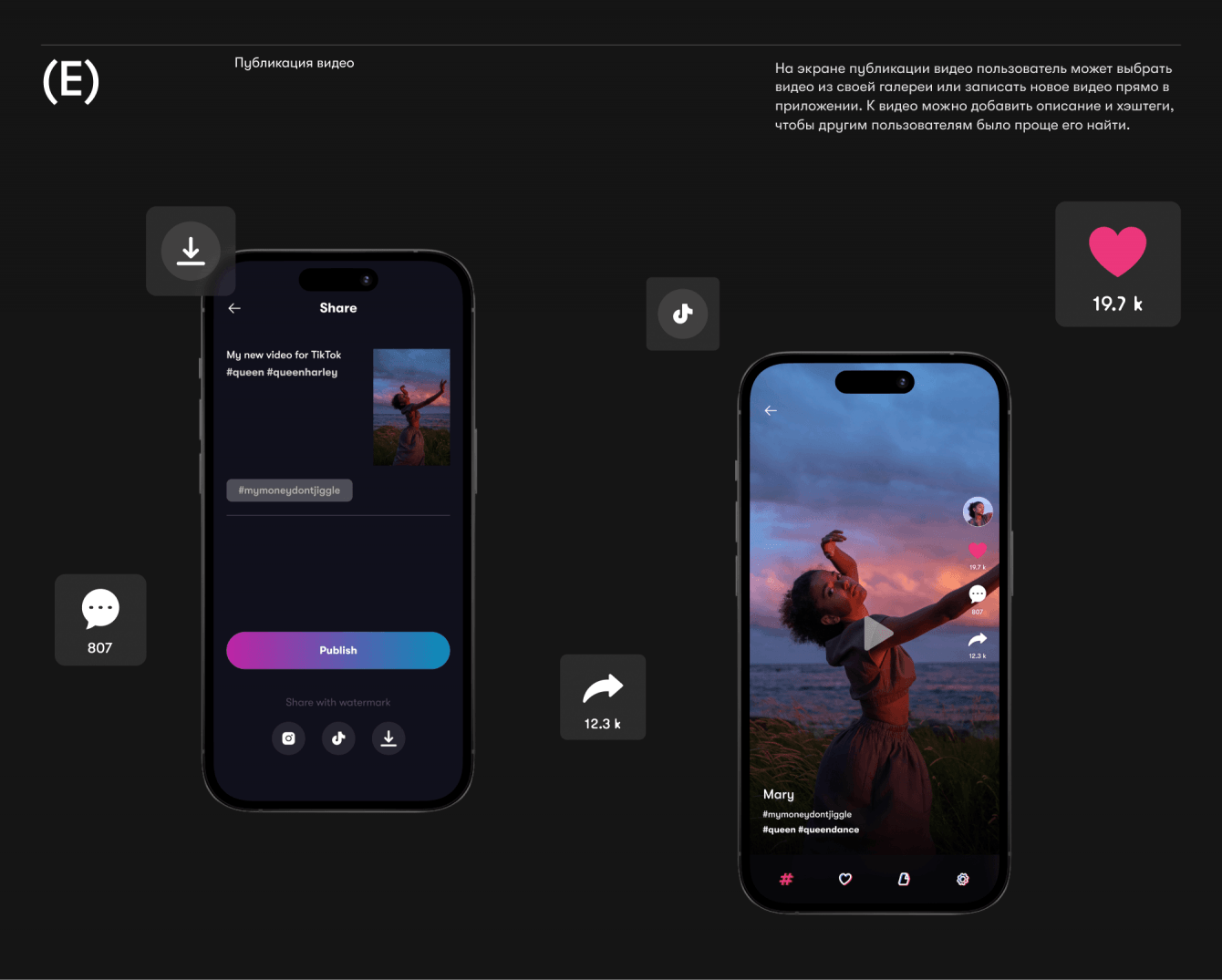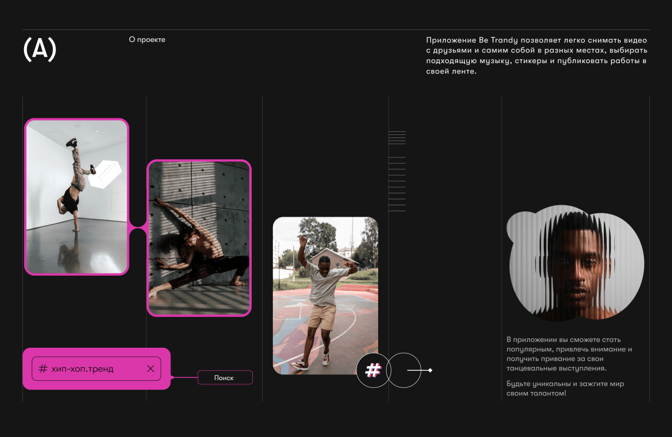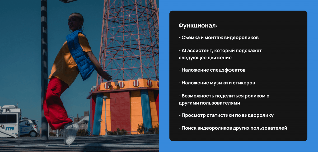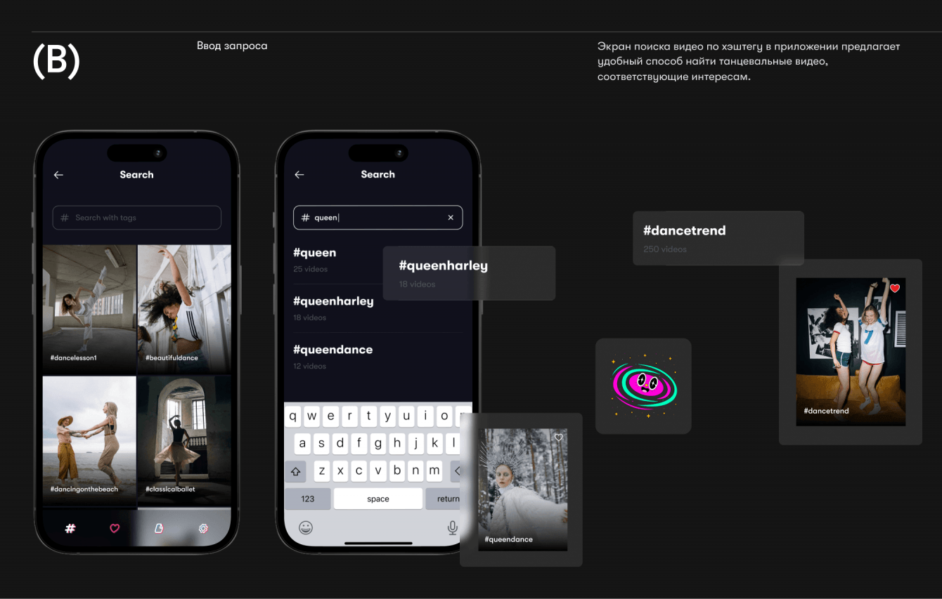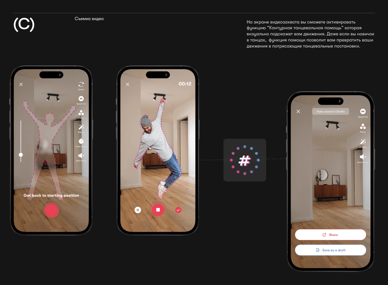 Заказчик обратился к нам с задачей разработать мобильное приложение, которое поможет любителям танцев изучать новые движения, повторяя их за контуром в приложении, и создавать стильные танцевальные видео для публикации в социальных сетях.