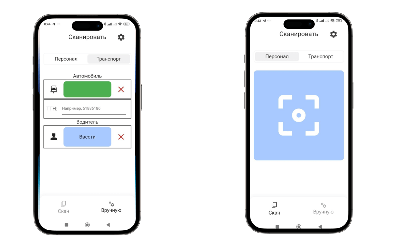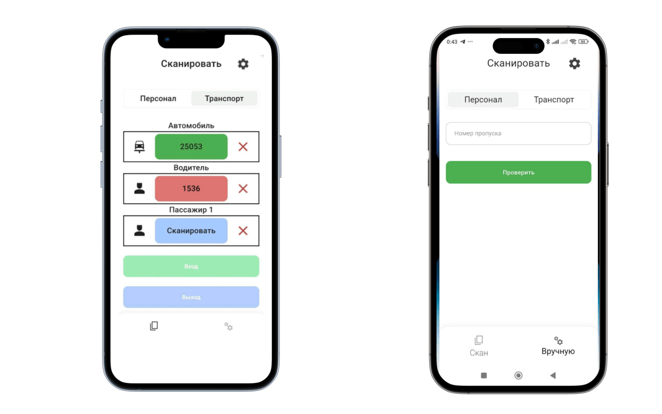 Создание удобного интерфейса для охранников и сотрудников, которые будут взаимодействовать с приложением. Особое внимание уделили простоте и надежности работы в плохих погодных условиях. На данном этапе добавили возможность ручного ввода номера пропуска, если не получалось отсканировать код (запотевание экрана, холод, загрязнение камеры и пр.)