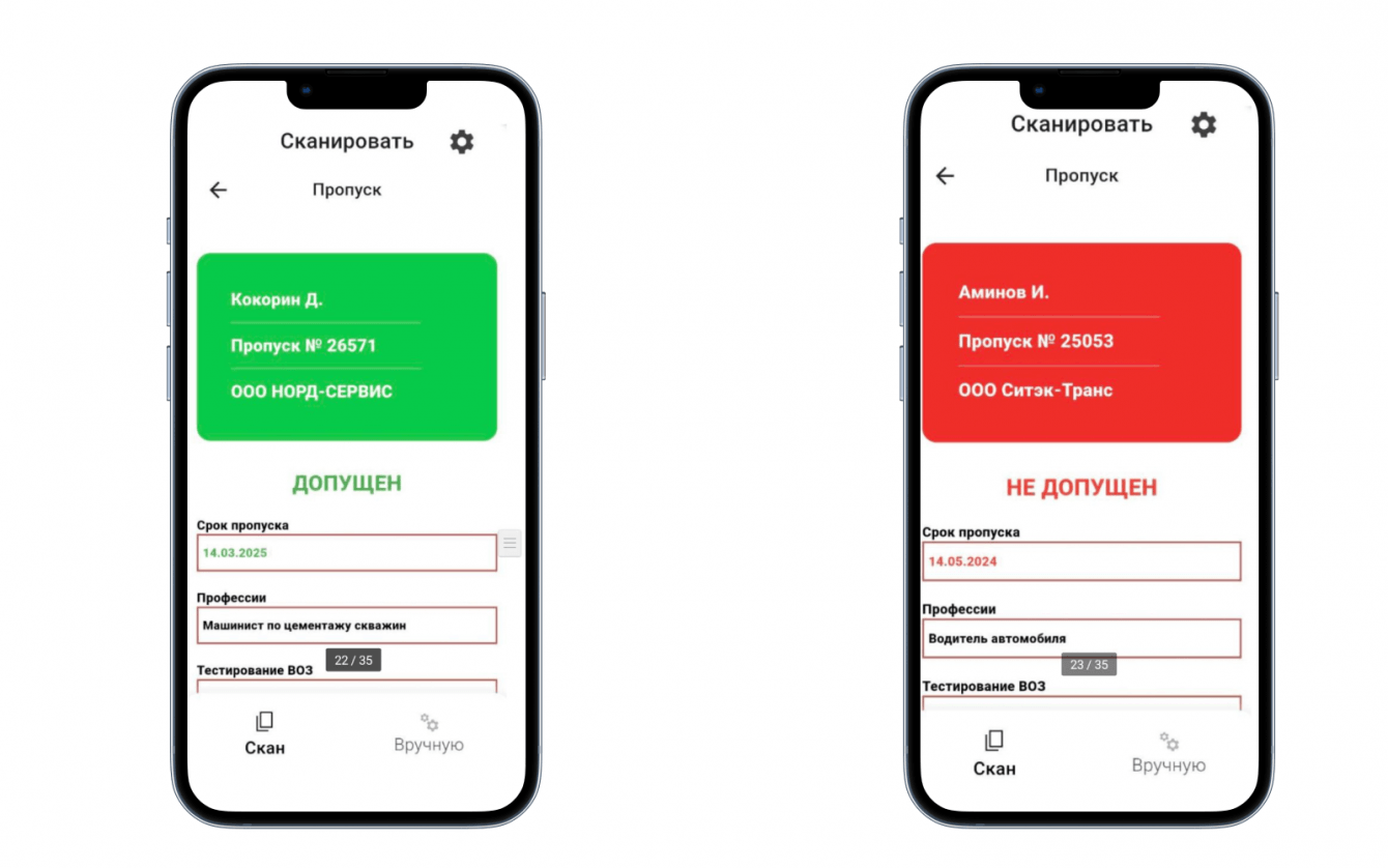 Проверка допусков сотрудников на объект через интеграцию с базой данных (допуски по медосмотрам, нормативам по безопасности и квалификации).