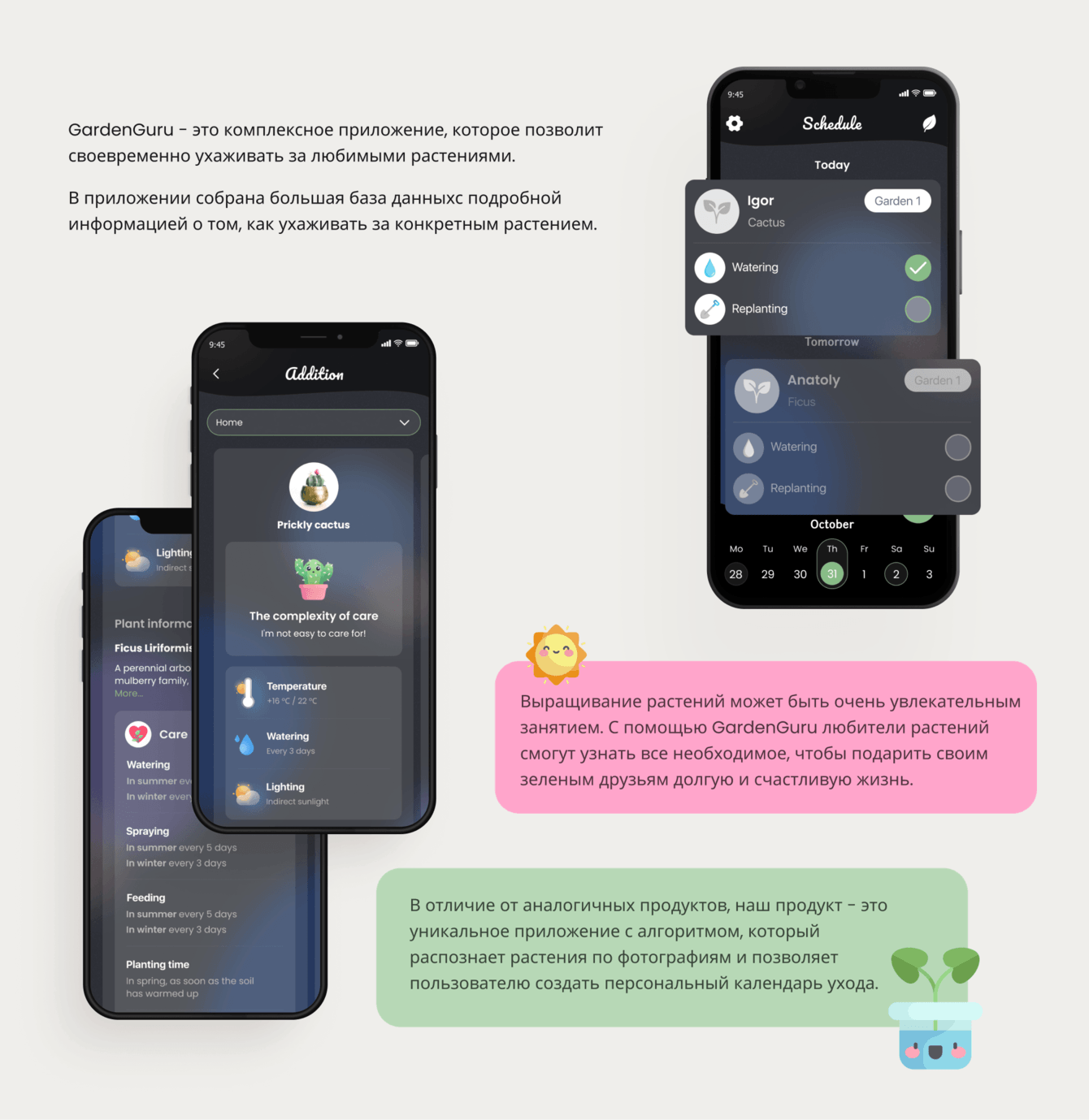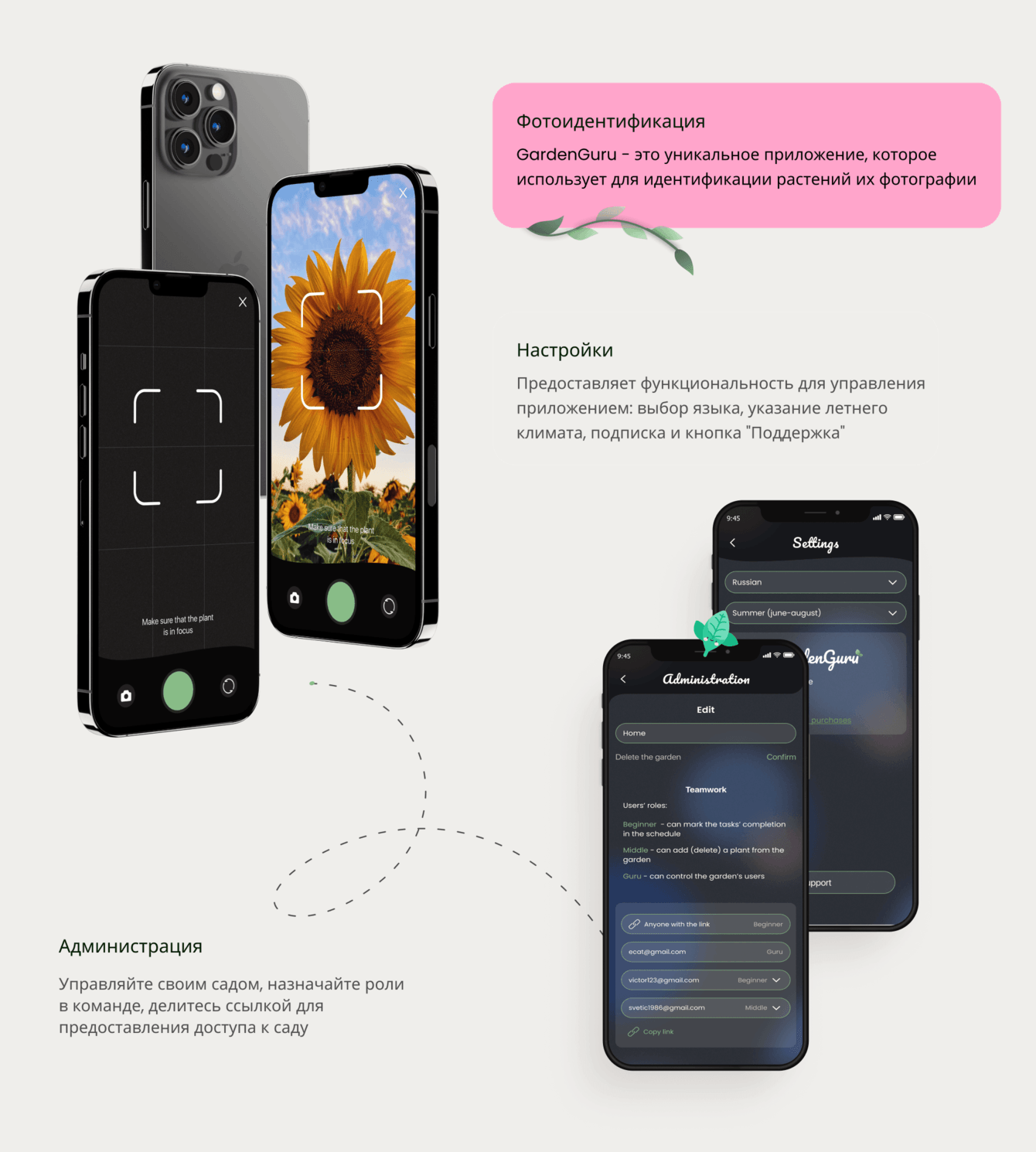 Удобный интерфейс и интуитивно понятный дизайн: Мы уделили особое внимание разработке удобного интерфейса, который делает использование приложения простым и приятным даже для новичков в области садоводства.