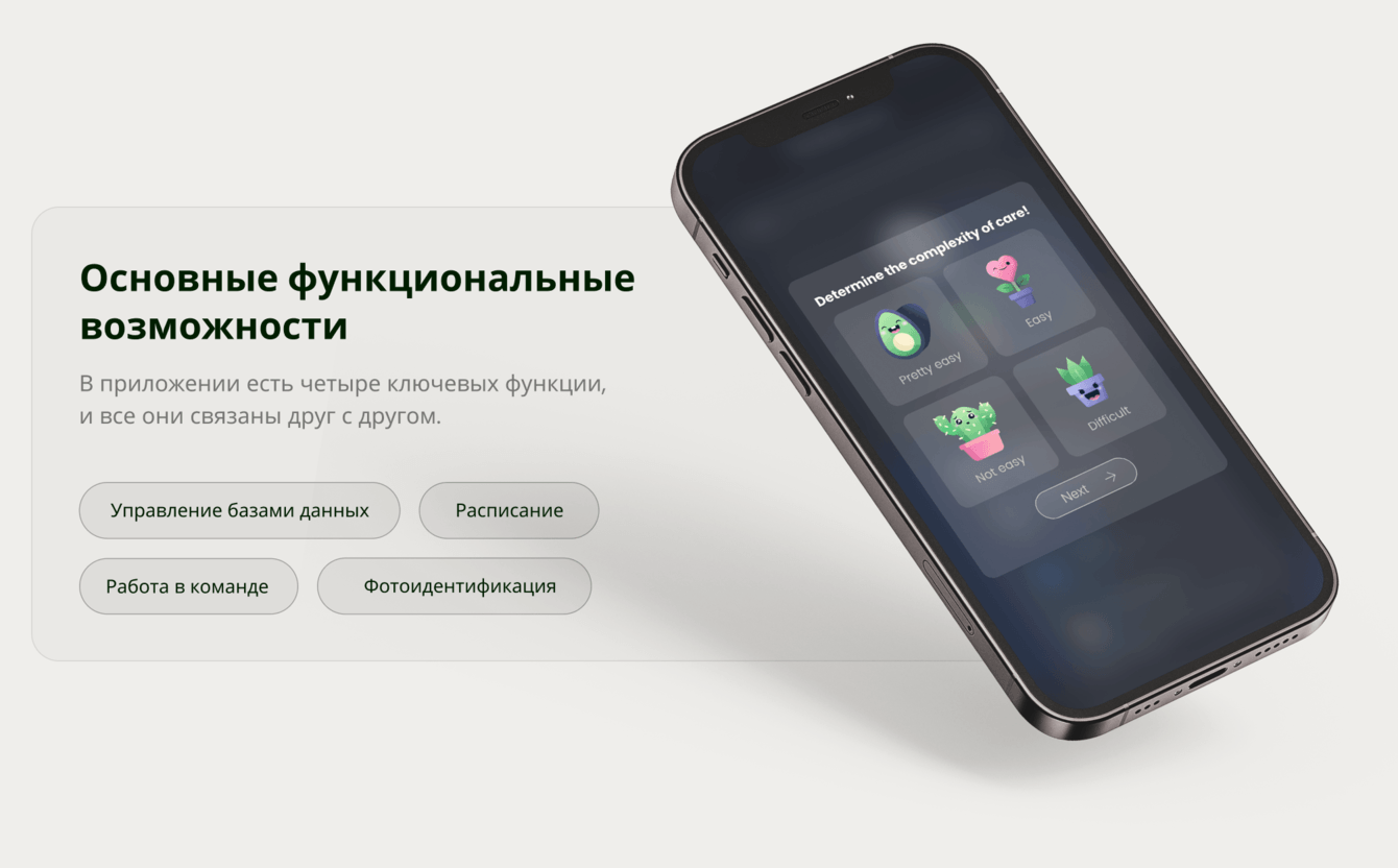 Важное требование заказчика обширная база данных о растениях, содержащая подробную информацию о каждом из них - от особенностей полива и освещения до сроков пересадки и борьбы с болезнями. Также заказчик выразил желание включить функцию распознавания растений через камеру смартфона для моментального определения вида растения и получения соответствующих рекомендаций.