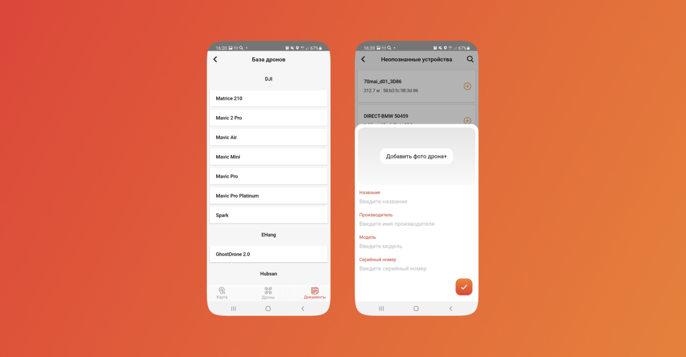 DronFinder осуществляет непрерывное фоновое сканирование на частоте 2,4 ГГц, распознавая при этом как зарегистрированные БПЛА, так и неизвестные устройства. Приложение рассчитывает расстояния до объектов, основываясь на мощности Wi-Fi сигнала, и сохраняет полученную информацию о зарегистрированных устройствах с привязкой к их IP.