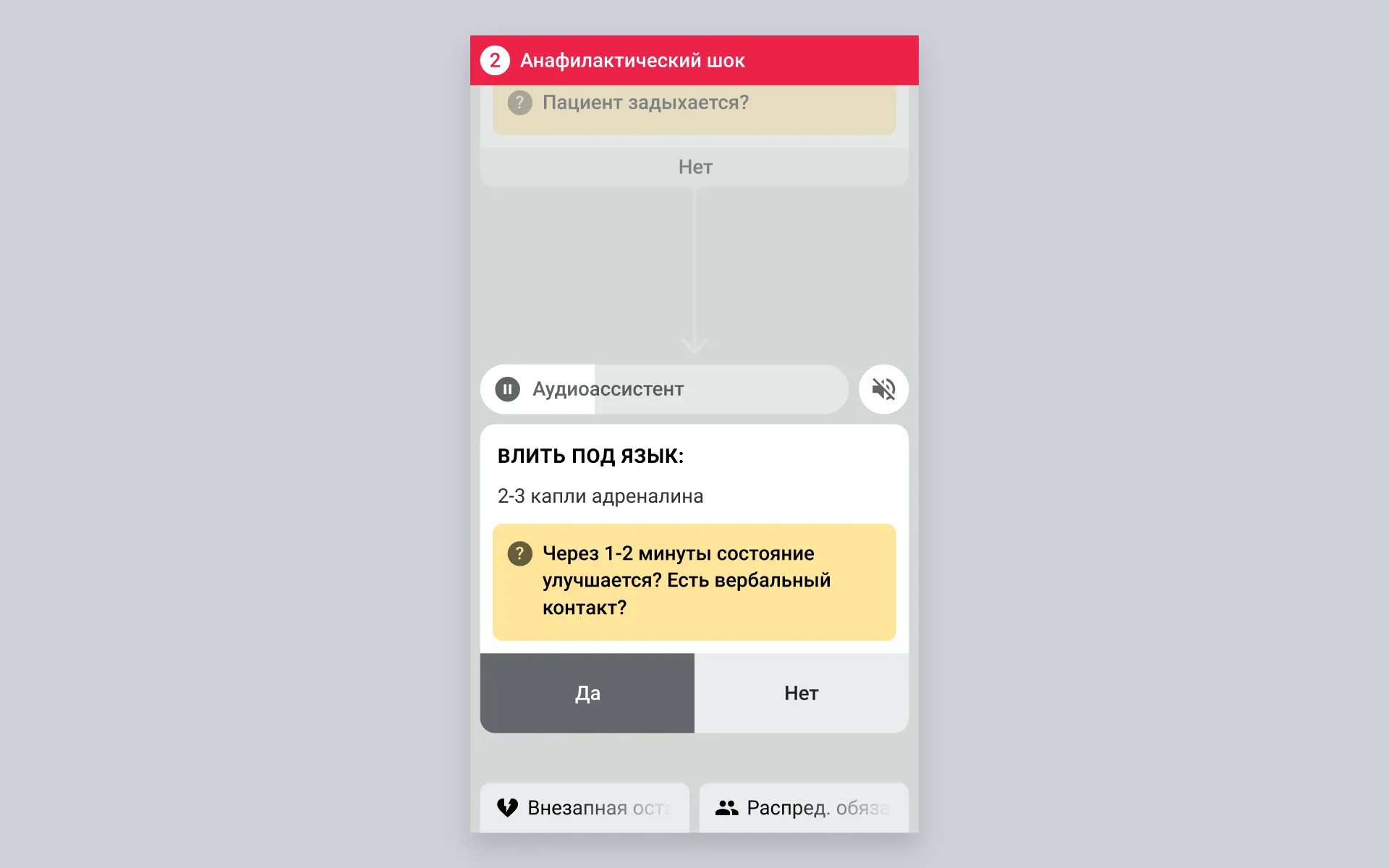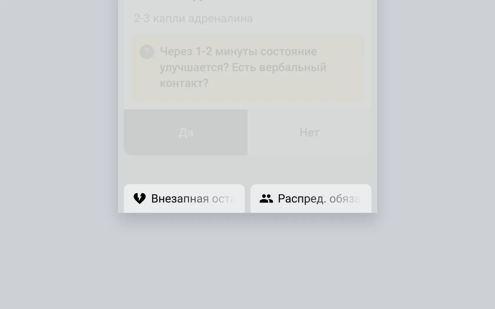 Похожая история с остановкой сердца. Это суперэкстренная ситуация, которая может случиться посередине процесса реанимации. В бумажном варианте это означает «отложить одну инструкцию и взять другую», в случае со смартфоном было бы хорошо предусмотреть экстренную кнопку сразу на экране. Поэтому мы добавили кнопку «Внезапная остановка сердца» в нижнюю часть экрана рядом с «Распределением обязанностей».