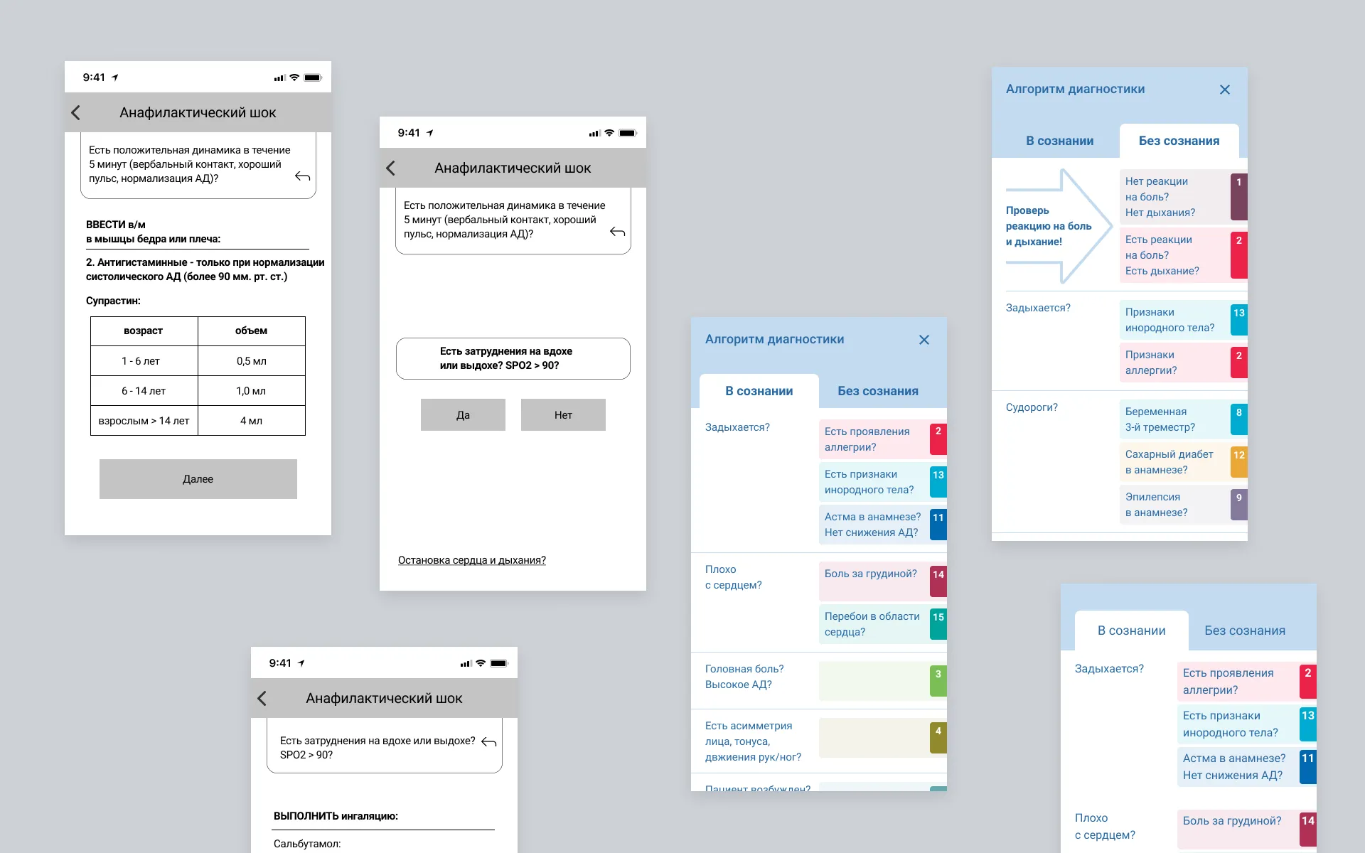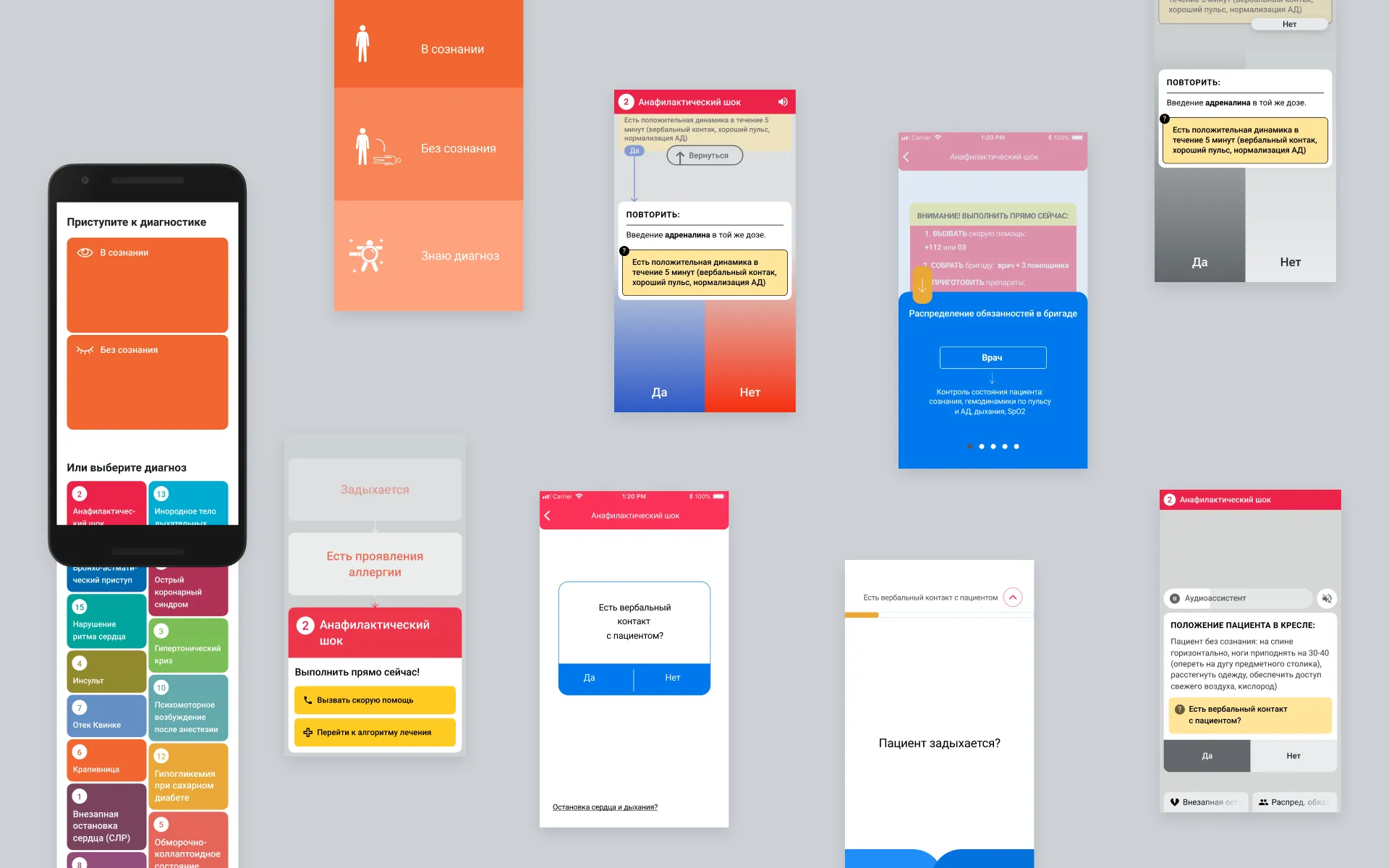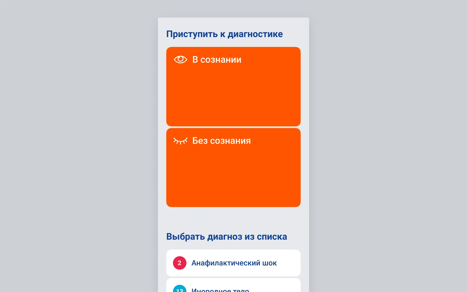 Почему? Потому что на скорость и качество восприятие информации влияет примерно всё: цвет, шрифт, размер иконок, навигационные паттерны. Вторая причина — алгоритм диагностики (то есть определение, что же случилось с пациентом) «в лоб» не переносился с формата плаката А3 на экран мобильного. Нужно думать.