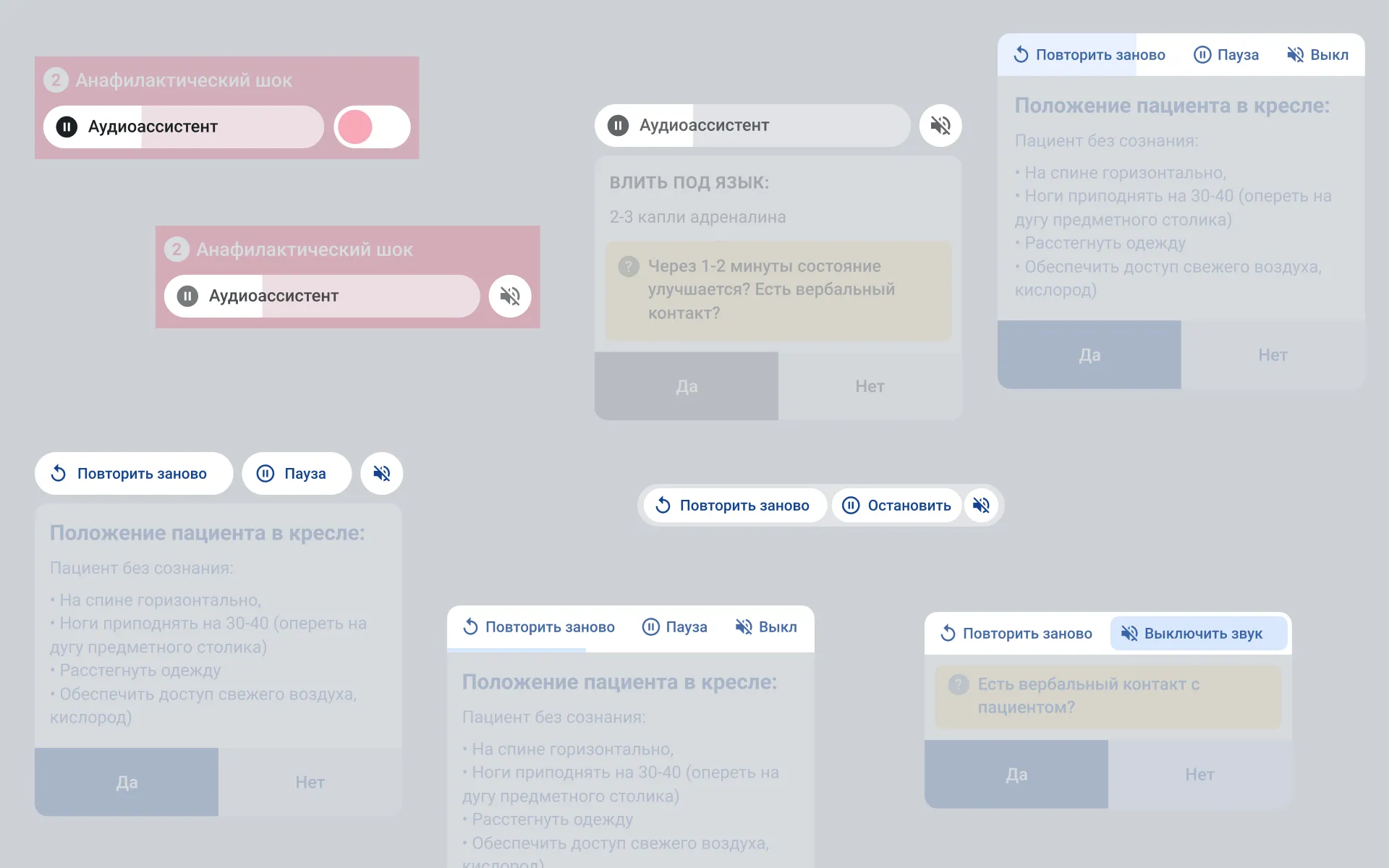 Сперва это был просто плеер с полосой прогресса. Только зачем видеть прогресс? Убрали. Потом поняли, что нажимать на каждом шаге на кнопку «Плей» — так себе решение, и сделали автоматическое воспроизведение. Только что делать человеку, если он не хочет слушать аудиоинструкции? Нажать «Стоп»? Не успеет — там всего одна-две фразы. Поэтому мы убрали обе кнопки (или одну в двух состояниях) и заменили их на «Выключить звук». А рядом поставили «Повторить заново» — для тех, кто хочет слушать аудиоинструкции.