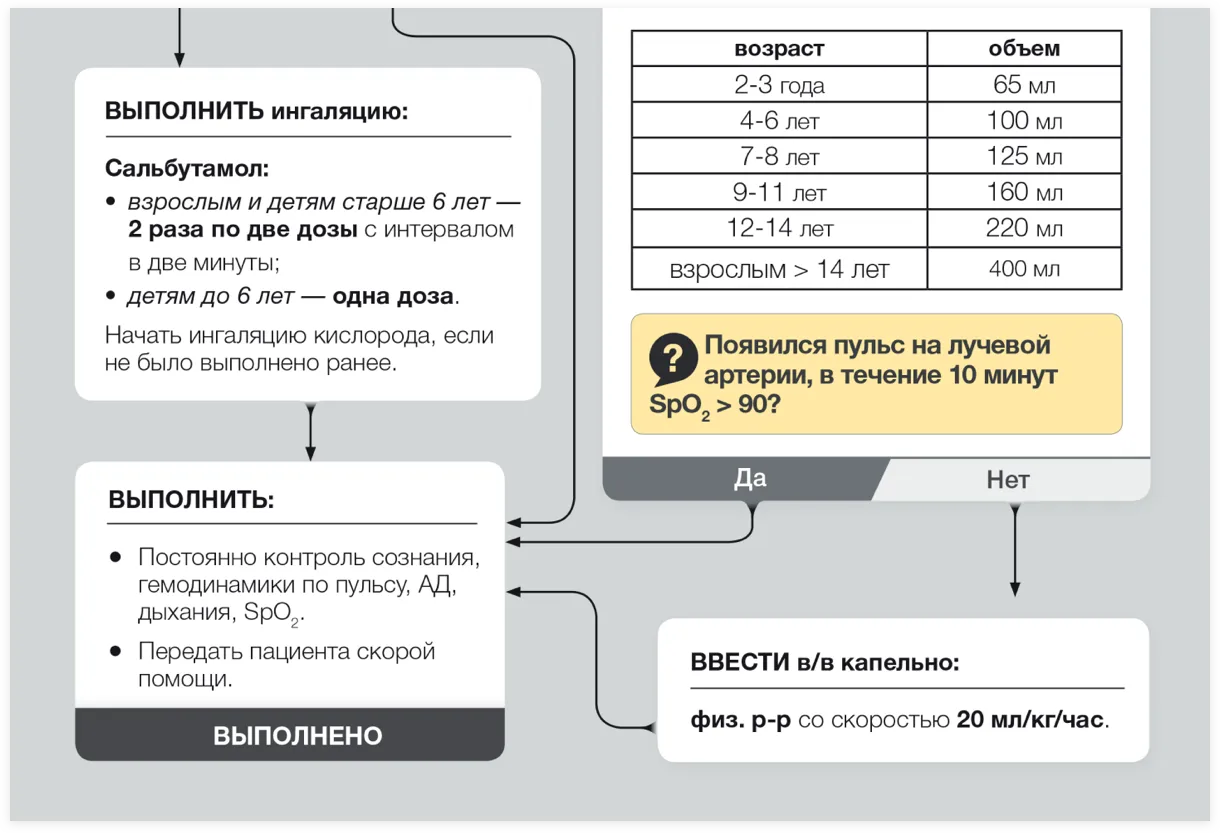 Во время реанимации у пациента может остановиться сердце. В таких ситуациях врач должен мгновенно переключиться на другой алгоритм. Мы вставили ссылку на него в нижнюю часть экрана