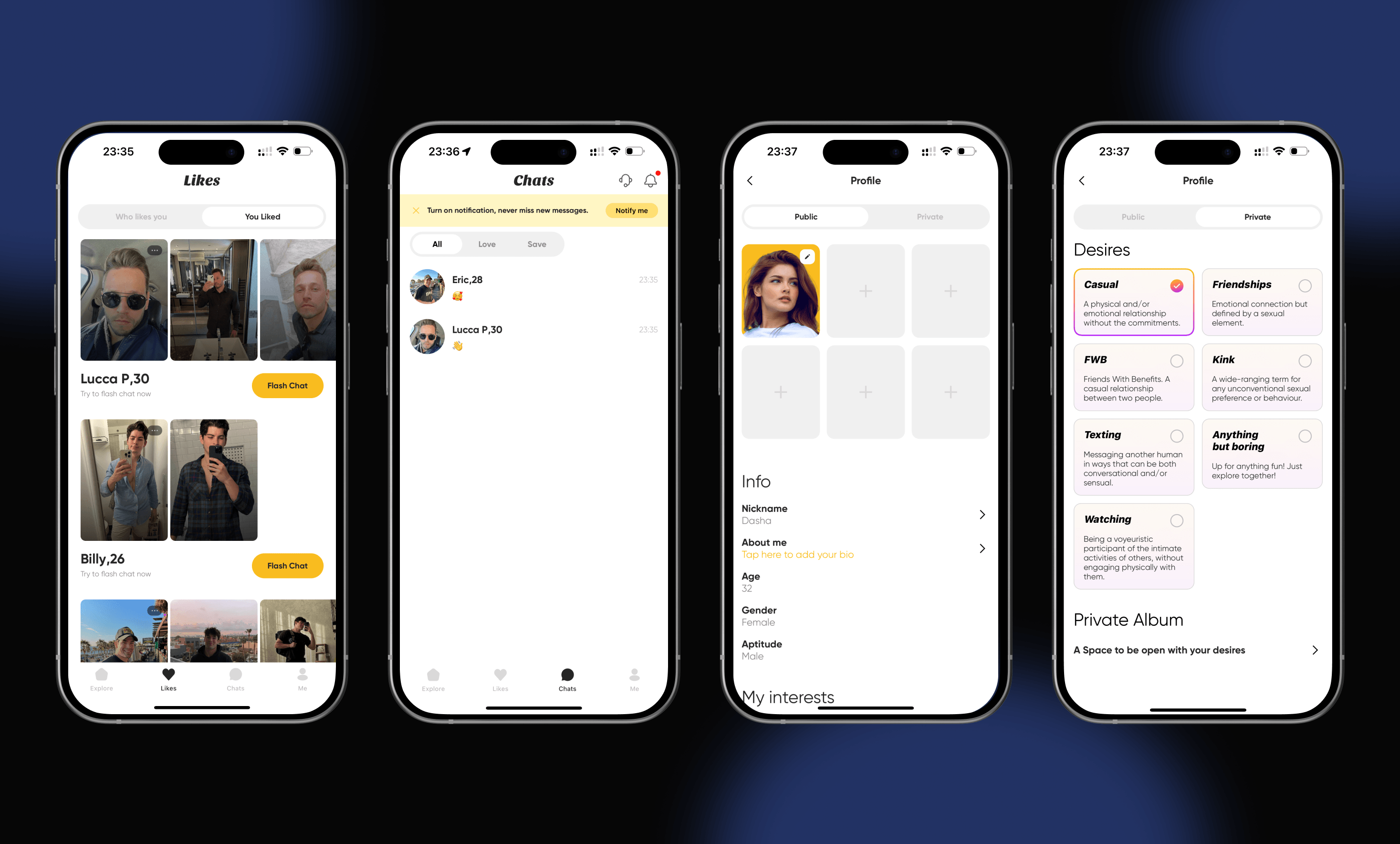 После согласования логики приступили к дизайну — адаптировали стиль под мобильные платформы, учли особенности dating-сервисов: фокус на фото, минимум отвлекающих элементов, акценты на действии.