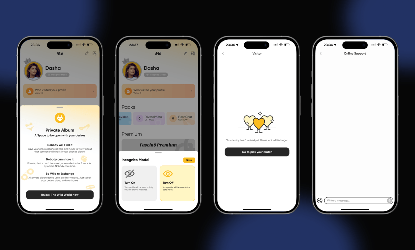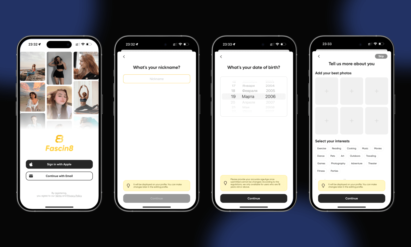 Fascin8 — проект с живой, лёгкой атмосферой, где каждый экран подталкивает к приятным знакомствам. Мы сделали акцент на функциональность, которая упрощает процесс — от поиска до чата — чтобы пользователь не терялся в интерфейсе. Сочетание лёгкости, скорости и надёжности — именно так мы представляем идеальную dating-платформу. Радует, что результат нравится и клиенту, и его аудитории.