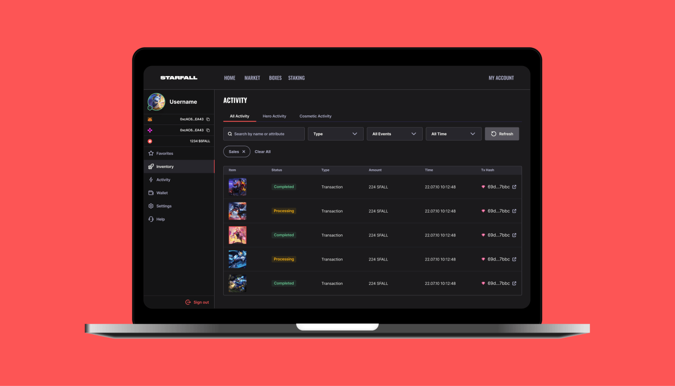 — Создали интуитивно понятное веб-приложение, позволяющее пользователям легко создавать аккаунт, приобретать героев, предметы или ящики с криптовалютой, а также просматривать историю транзакций
