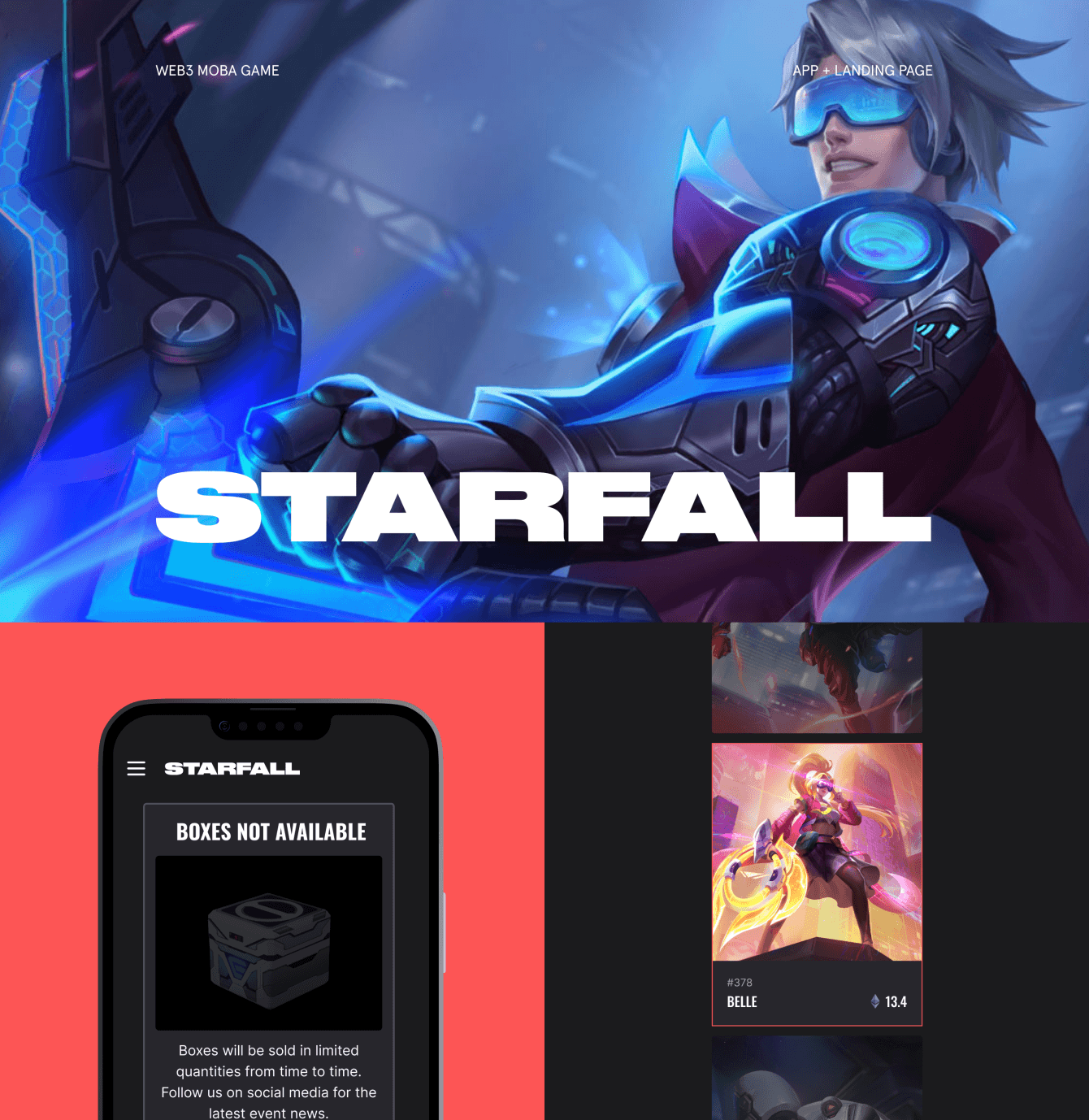 Перед нами стояла задача разработать новую Landing Page для проекта, которая передавала бы дух игры и вовлекала пользователей во вселенную Starfall Arena. Кроме того, необходимо было создать удобное веб-приложение.