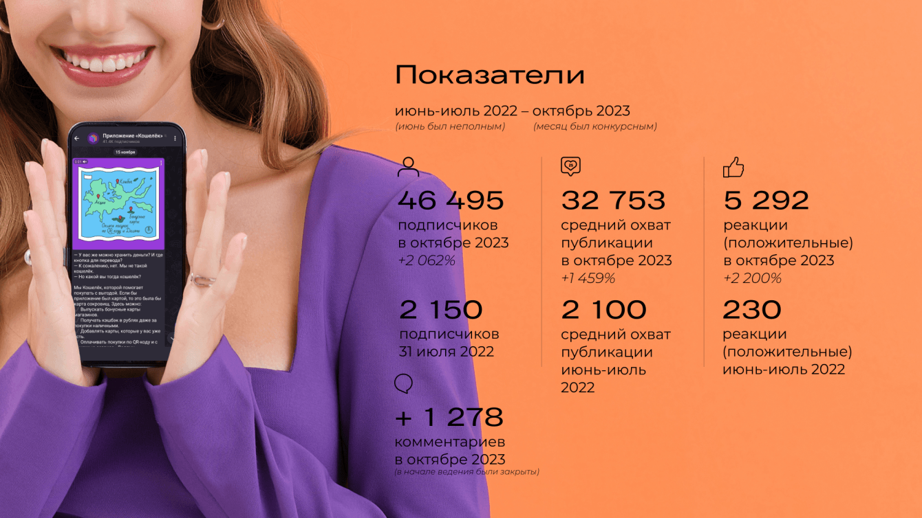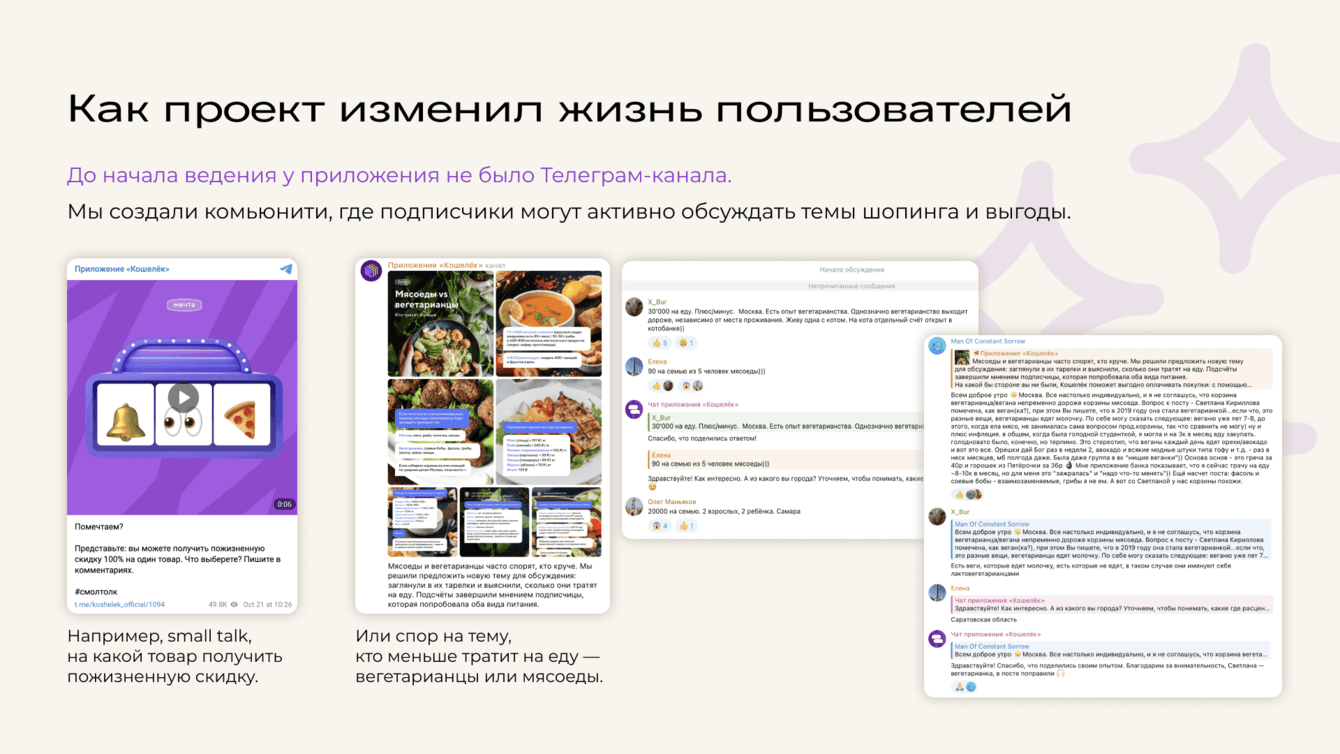 До начала ведения у приложения не было Телеграм-канала. Мы создали комьюнити, где подписчики могут активно обсуждать темы шопинга и выгоды. Например, small talk, на какой товар получить пожизненную скидку, на что не жалко денег или спор на тему, кто меньше тратит на еду — вегетарианцы или мясоеды. Подписчики вступают в диалог и делятся мнениями — такой контент набирает сотни комментариев. Мы ушли от формата «вещает только Кошелёк» и стали публиковать то, что интересно обсуждать.