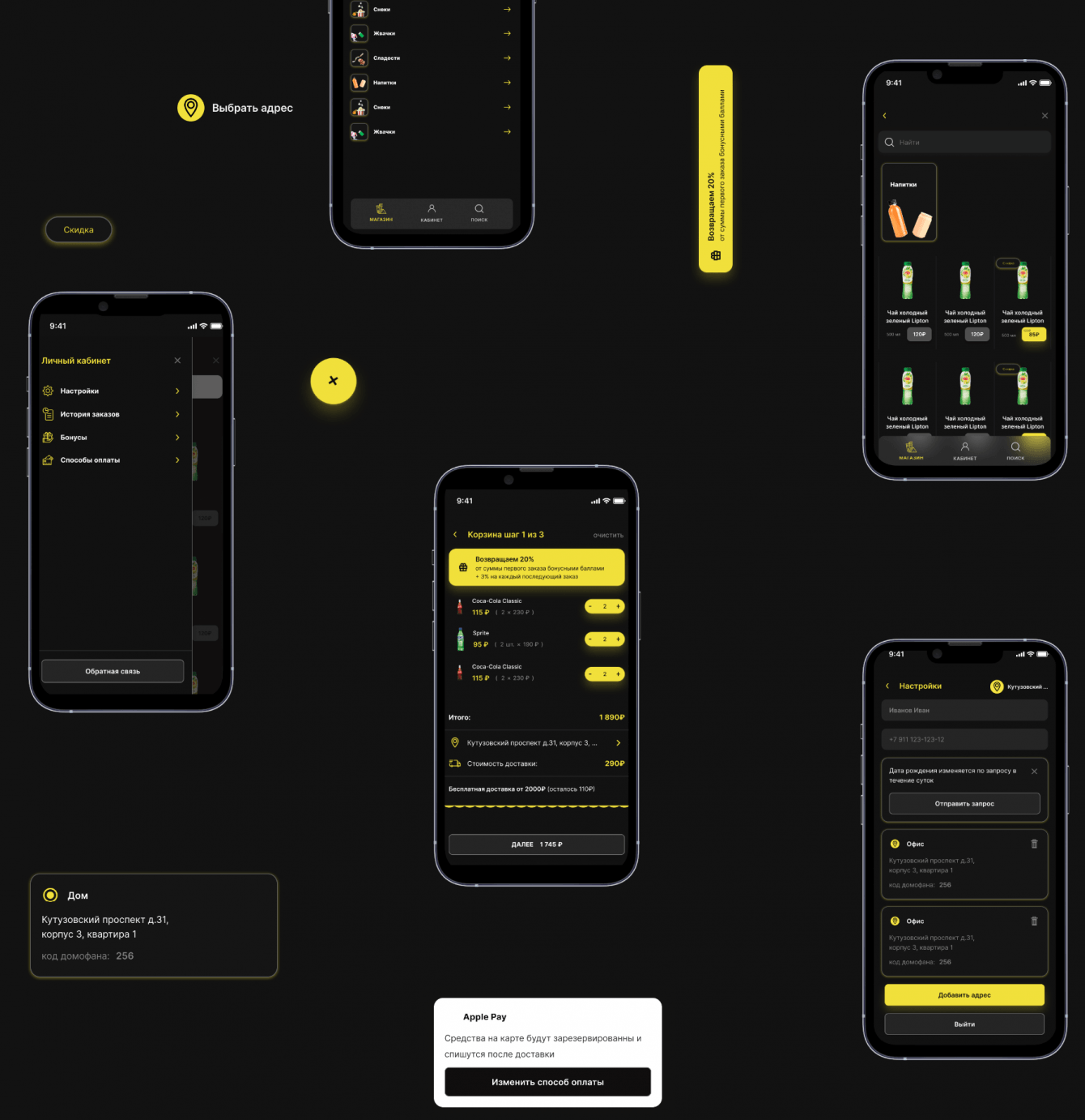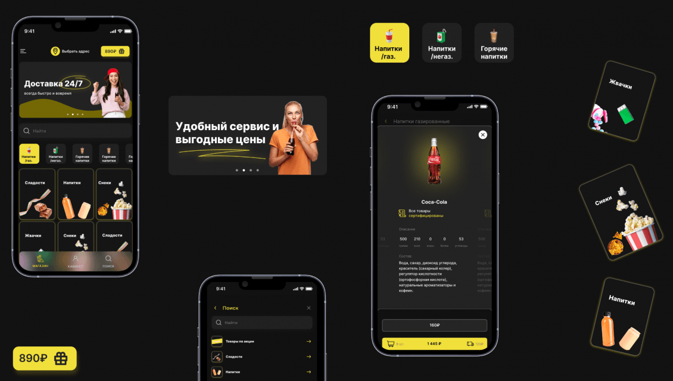 Цветовая гамма была выбрана исходя из фирменных цветов игровых клубов, куда будет доставляться продукция. Функции в приложении являются стандартными для сервиса доставки: есть возможность зайти в каталог, изучить карточку отдельно выбранного товара и оформить доставку. Разработка велась на Flutter, так как он позволяет создать приложение с одним массивом кода и для IOS и для Android.