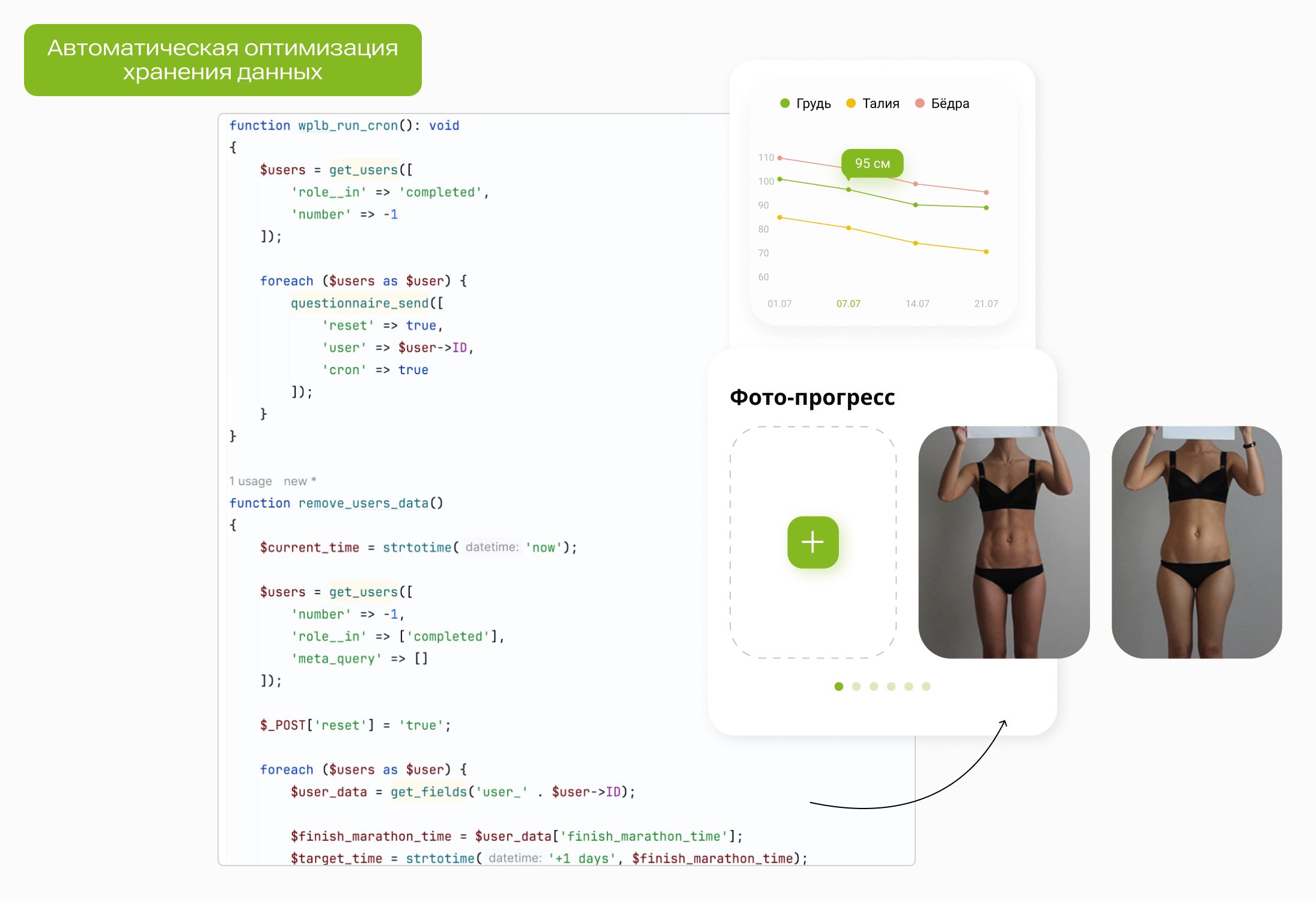 После завершения марафона все персональные данные — индивидуальные планы, фотографии, графики прогресса и отчёты — автоматически удаляются через неделю. Это помогает пользователям не беспокоиться о сохранности лишней информации и защищает их приватность без необходимости ручной очистки. Кроме того, удаляются все связанные записи в базе данных, чтобы не засорять систему и не расходовать лишнюю память на хостинге. При этом учётная запись сохраняется — на случай, если пользователь захочет пройти курс повторно.