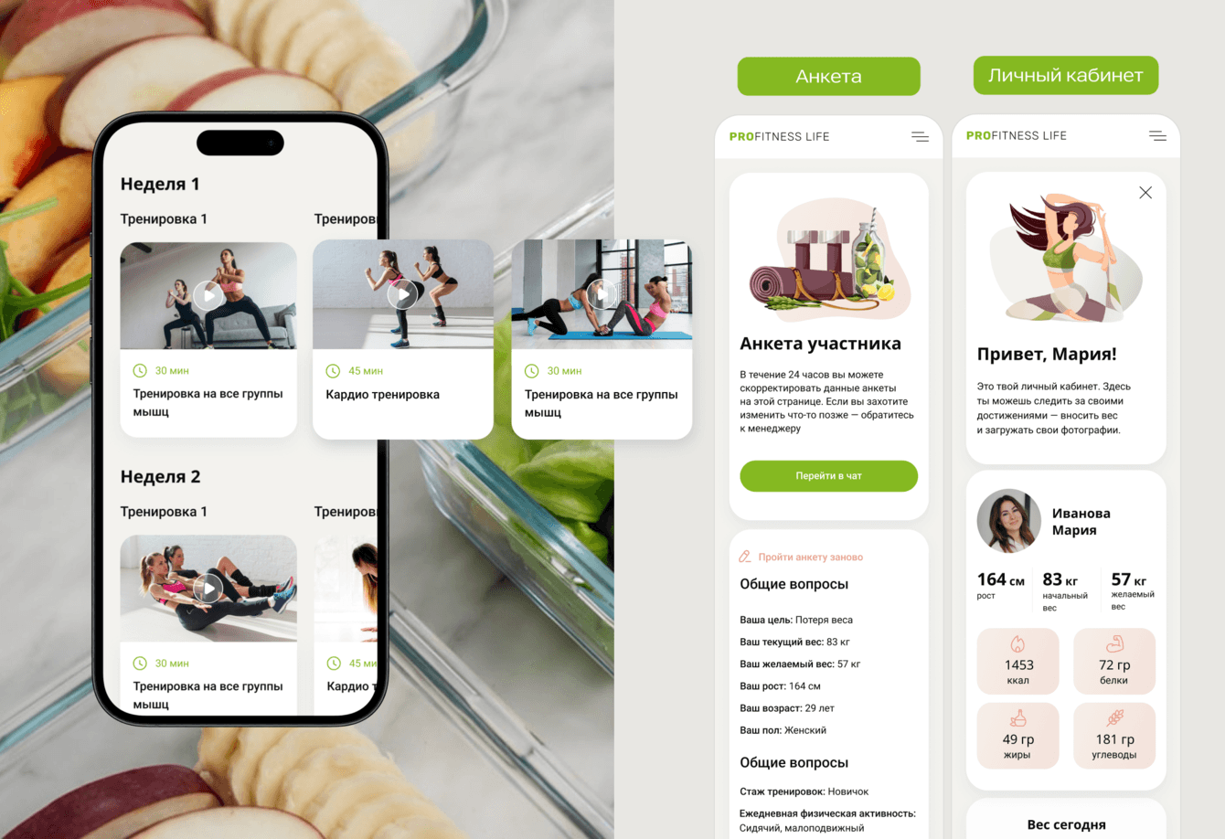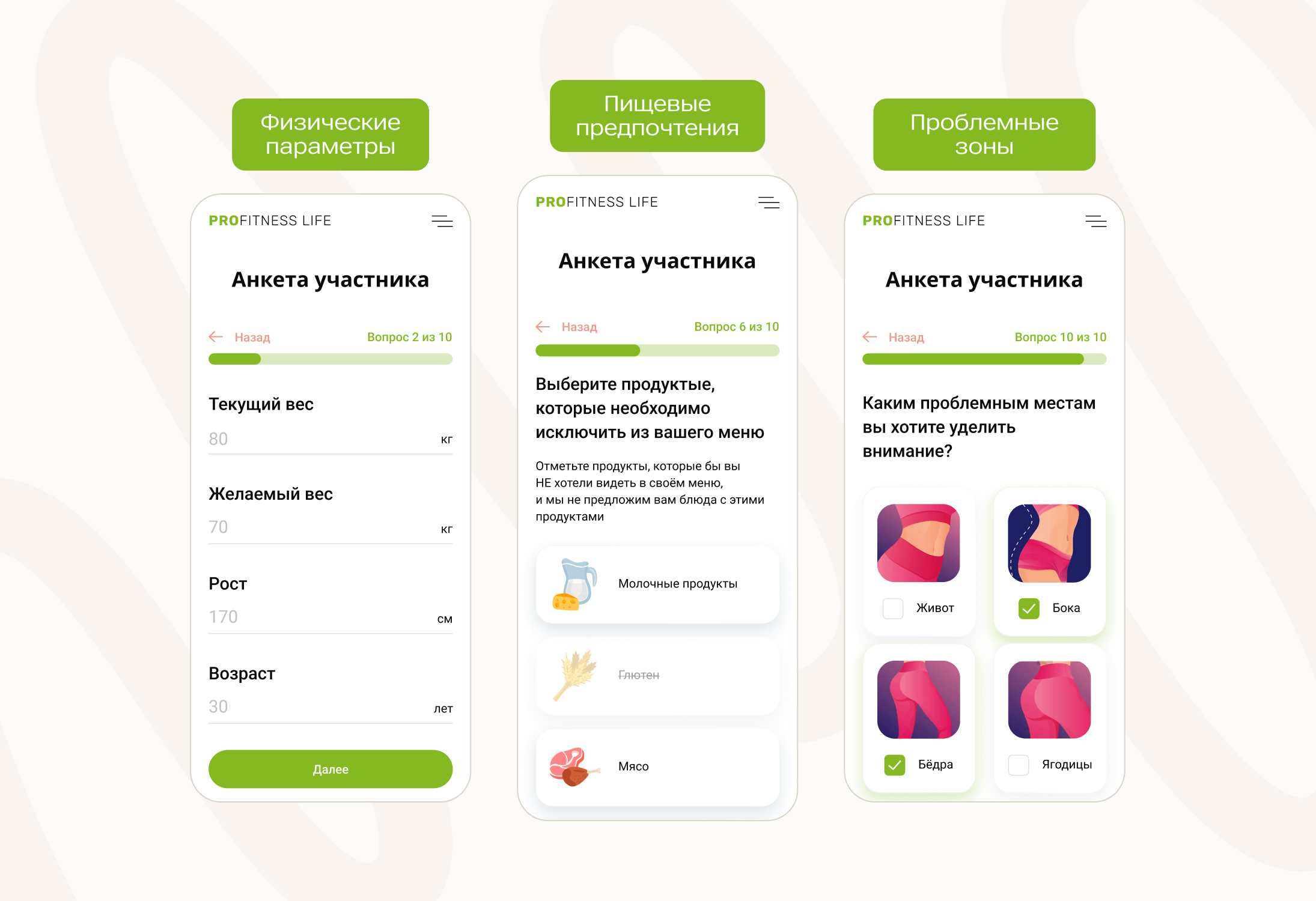 После регистрации пользователь проходит многоэтапную анкету, в которой указывает цели, физические параметры, пищевые предпочтения, ограничения по здоровью и зоны, требующие особого внимания в тренировках.