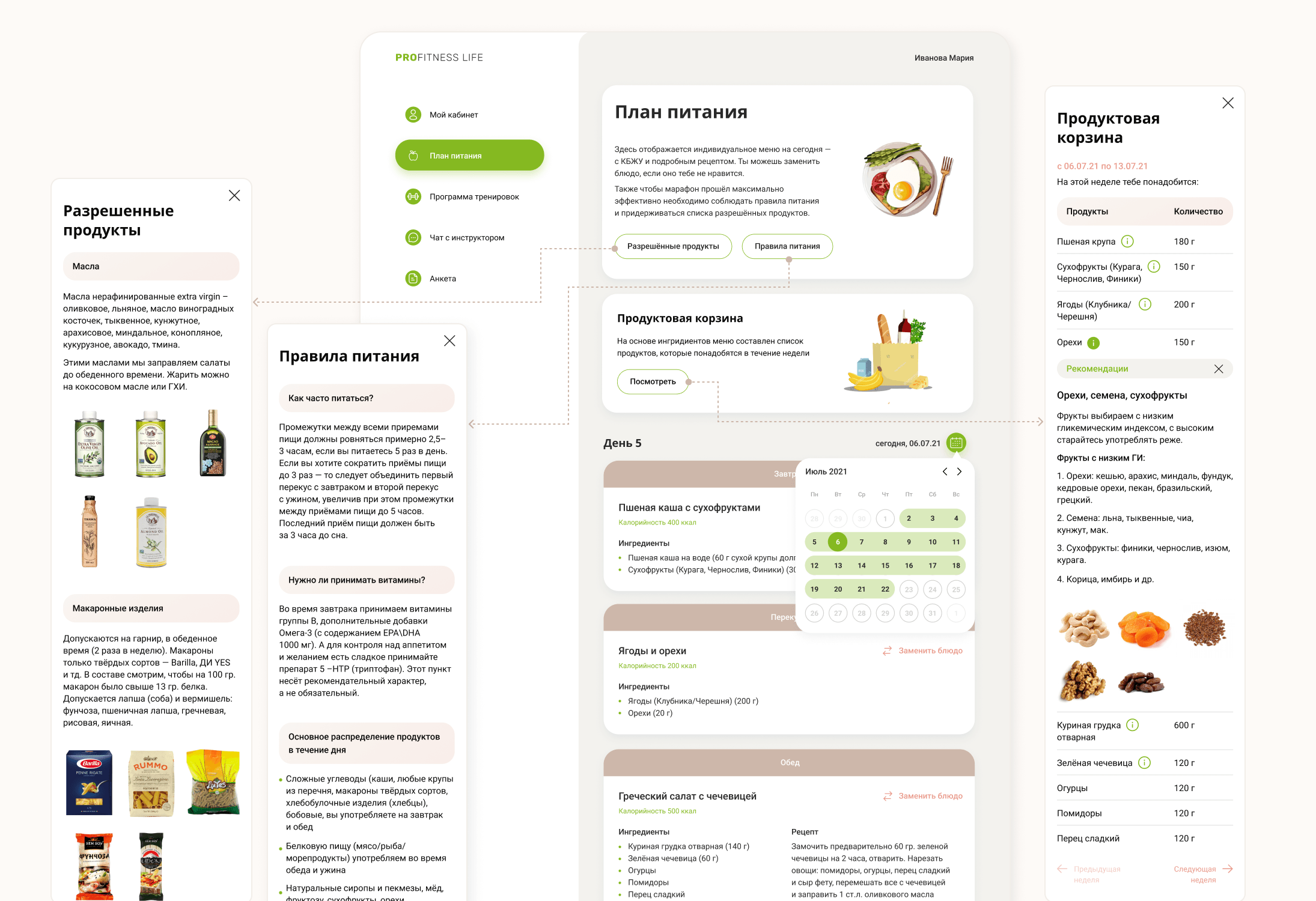 Чистый и понятный дизайн с интуитивной навигацией формирует ощущение доверия и заботы, а визуальная эстетика, ассоциирующаяся со здоровым образом жизни, подчёркивает лёгкость и чистоту взаимодействия с сервисом.
