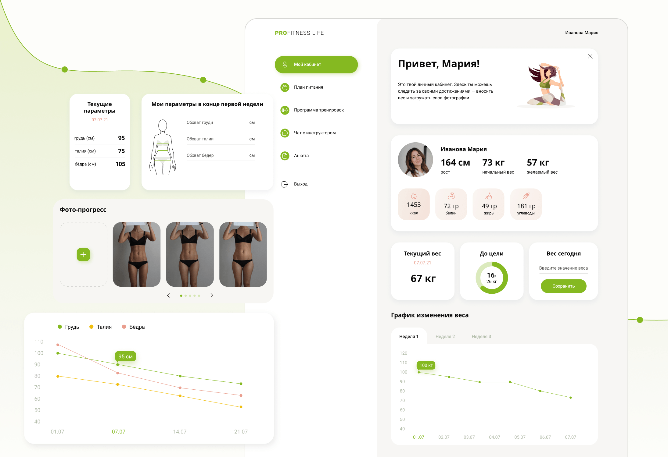 На основе введённых данных система строит динамические графики веса и изменения параметров тела, что позволяет визуально отслеживать прогресс. Дополнительно отображаются показатели по макронутриентам и калорийности для контроля рациона.