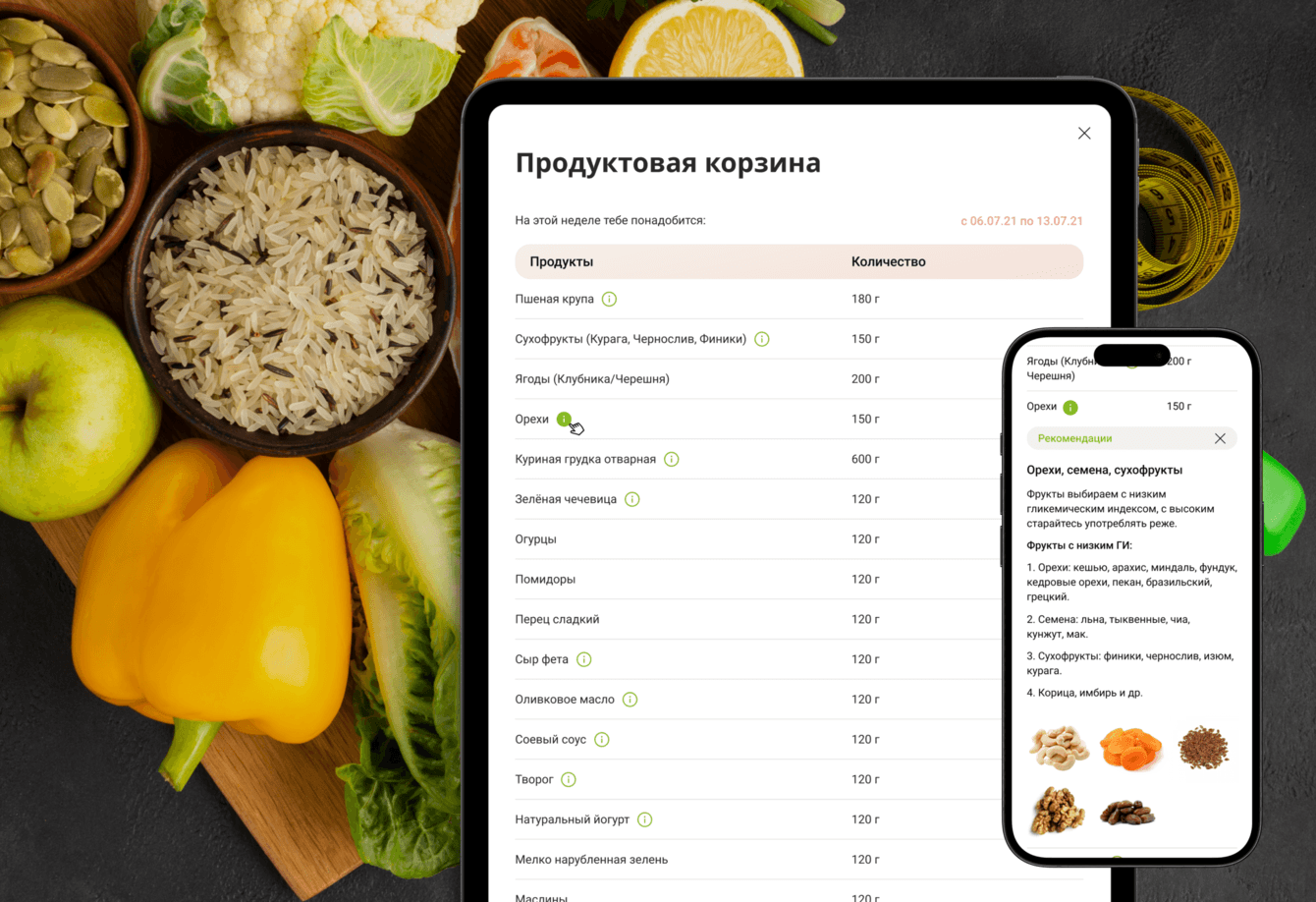Разработали удобный персонализированный онлайн-сервис с автоматическим формированием рекомендаций и продуктовой корзины под рацион для решения конкретных задач каждого пользователя.
