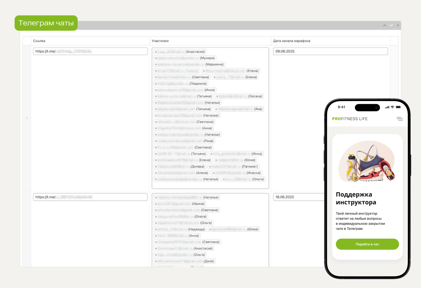 В личном кабинете реализовали модуль чата с инструктором. Система помогает подключить новых участников к поддержке после старта марафона, исключить необходимость ручного добавления в чаты, снижает риск ошибок и облегчает организацию процесса даже при больших потоках новых регистраций.
