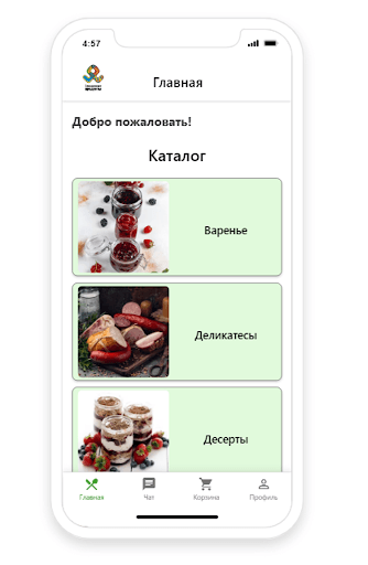 1. каталог с категориями продуктов питания и выбором продуктов данной категории с добавлением в корзину;