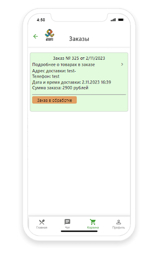 4. экран истории заказав, на котором отображаются сведения по заказу, а также статусы заказа и комментарии администратора по заказу с возможностью ответа на комментарий;
