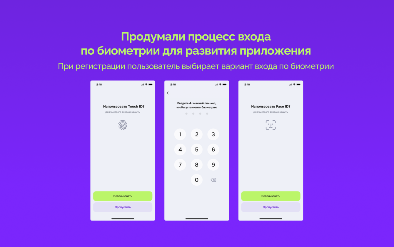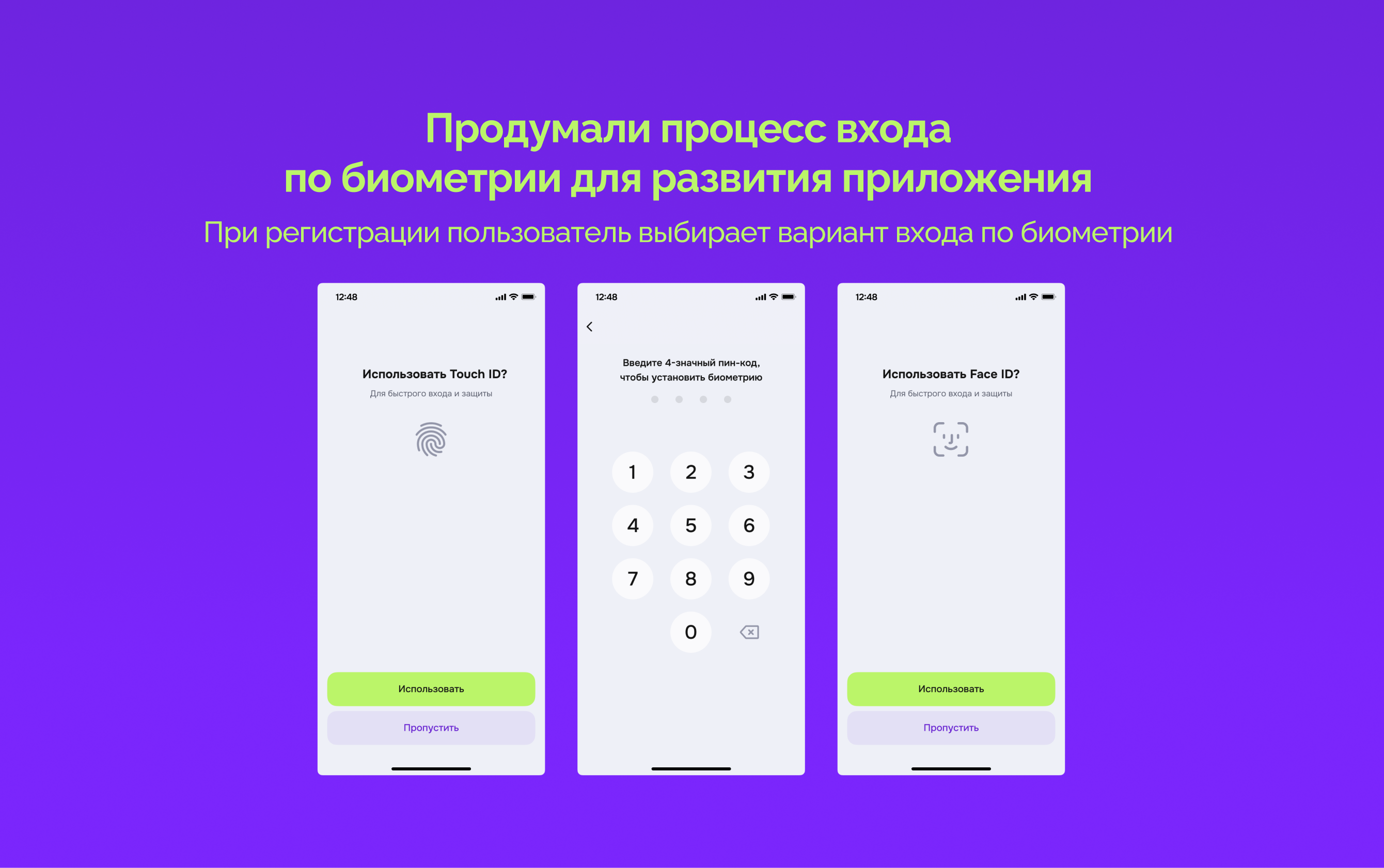 4. Проработали решение для входа по биометрии, чтобы пользователи могли авторизоваться по FaceID или TouchID за секунду. Для этого выстроили схему процесса интеграций с девайсами, которые поддерживают возможность входа по биометрии. Приложение само идентифицирует такую возможность и предлагает входить по биометрии после регистрации в приложении.
