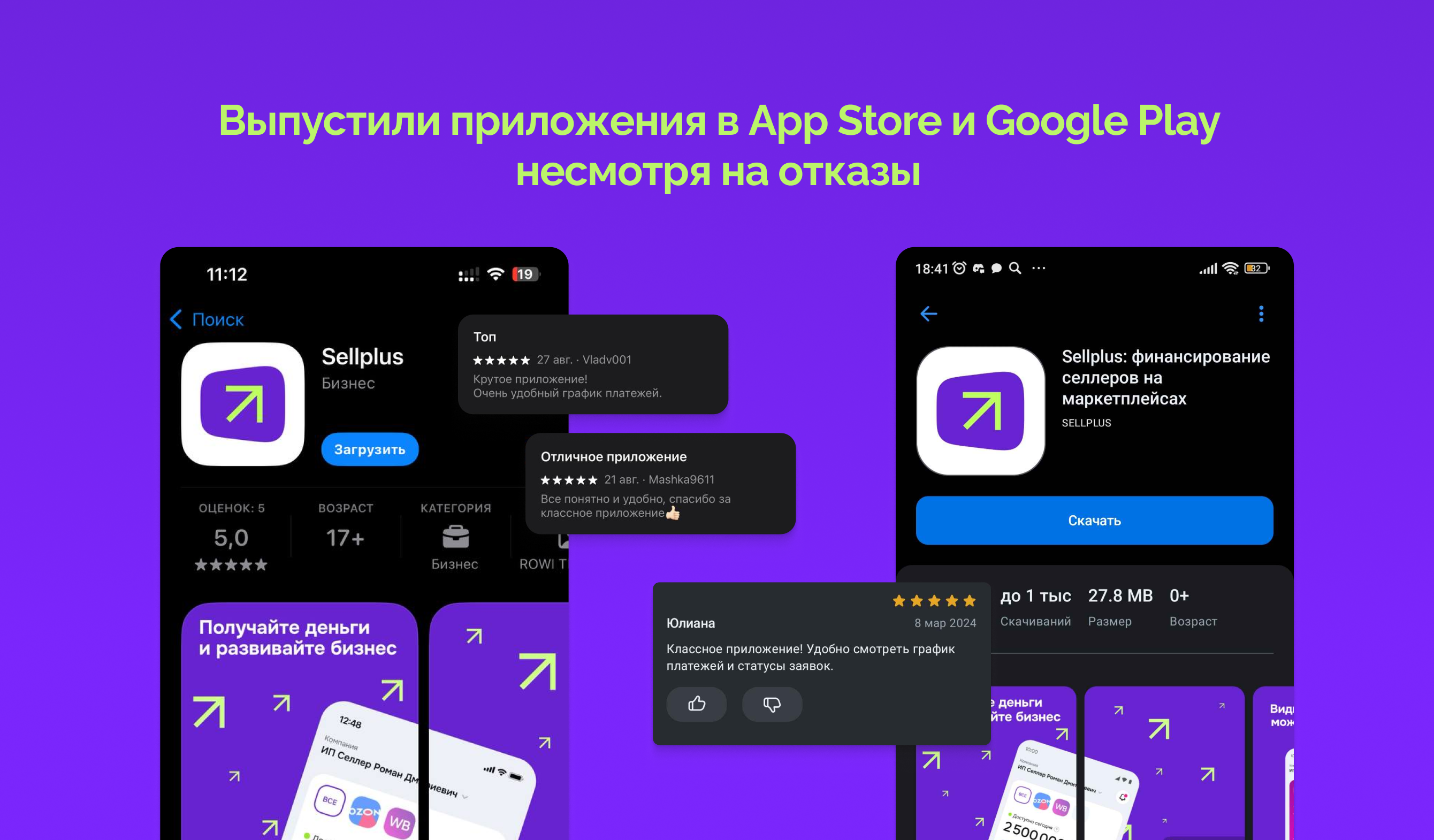 Это отдельная история — и отдельный вызов. Apple и Google отказали в публикации, решив, что Sellplus — кредитная организация. Для финансовых сервисов в сторах действуют жёсткие ограничения.