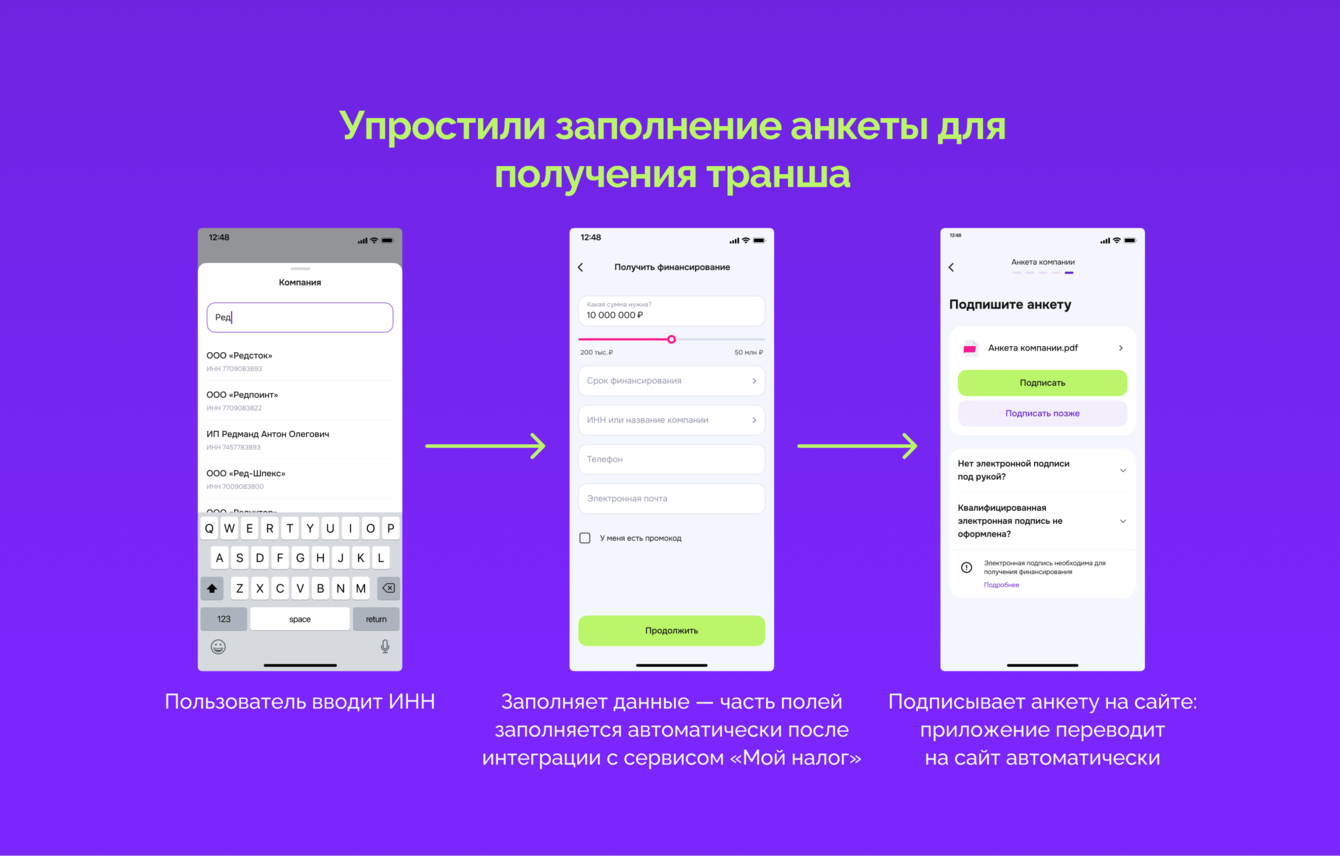Анкета заявки сокращена с 25 до 15 полей — оставшиеся заполняются автоматически по ИНН через интеграцию с «Мой налог». Подтверждение траншей по SMS полностью заменило ЭЦП — процесс, который раньше требовал перехода на сайт и работы с электронной подписью, теперь занимает один клик и код из сообщения.