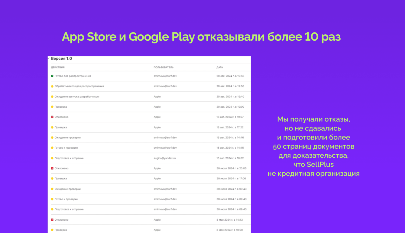 К новому 2024 году опубликовали приложение в RuStore. Зарубежные площадки сначала отказали SellPlus в публикации, так как решили, что это кредитная организация. Мы вместе с клиентом подготовили доказательную базу: собрали 50 страниц документов о деятельности компании.