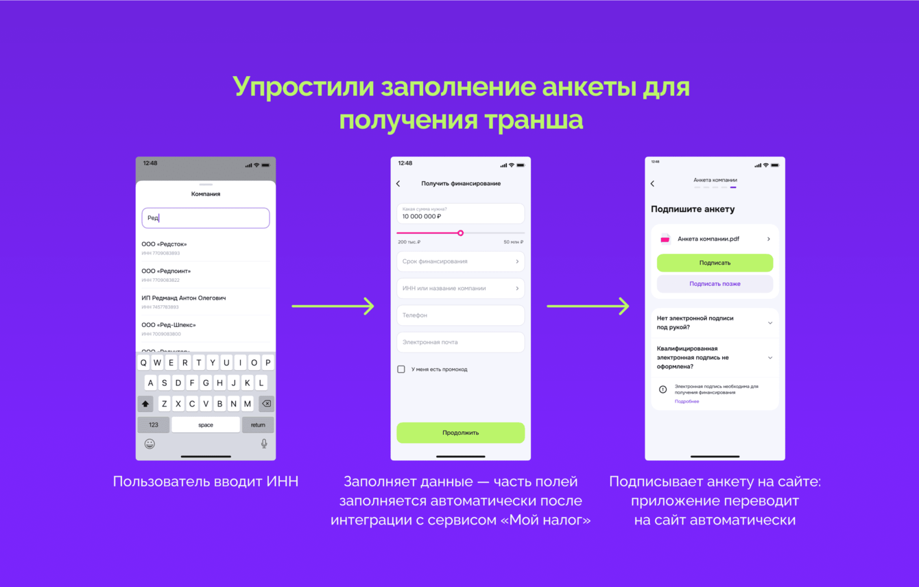 Компания была довольна результатами и предложила совместно развивать приложение дальше. Мы учли пожелания заказчика и разработали новые возможности для быстрого получения финансирования в приложении: