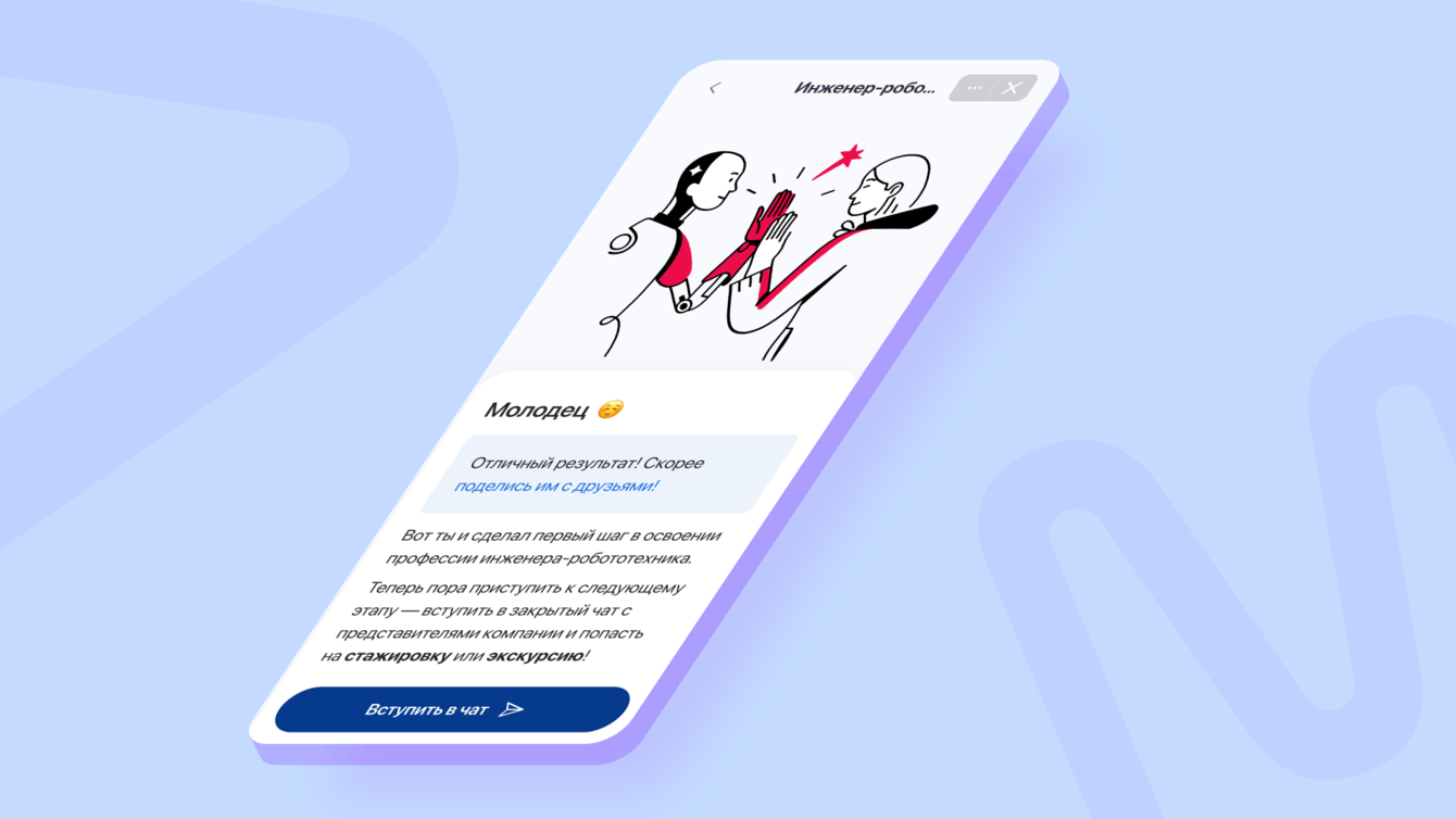 Экран с результатами показывает, успешно был пройден кейс или нет. Также на этом экране находится подборка фильмов и книг и кнопка «Вступить в чат».