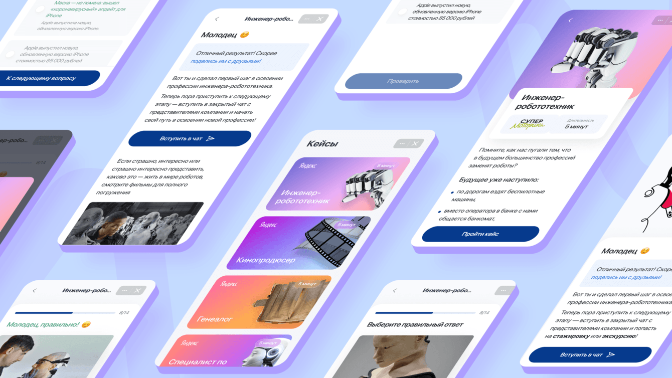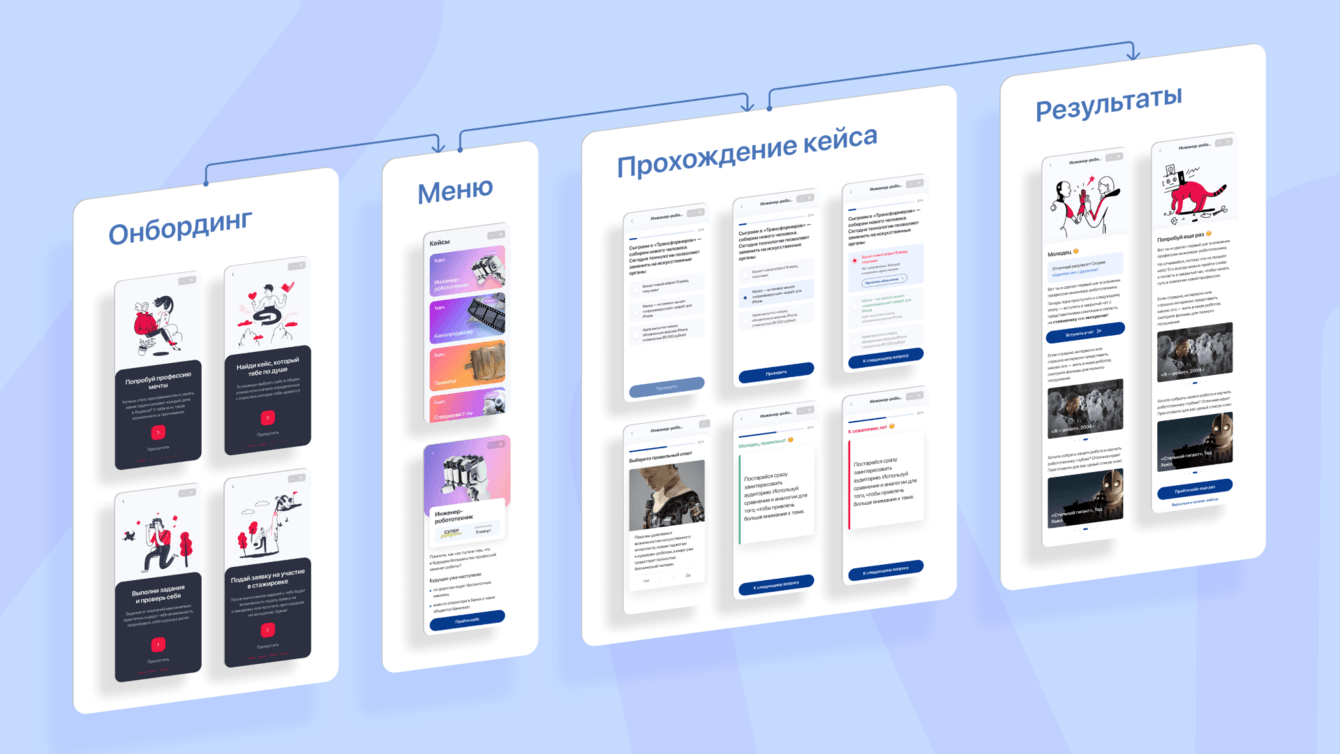 Онбординг показывается только 1 раз при запуске приложения и служит помощником для знакомства с его миссией. Далее пользователь попадает на экран со списком кейсов по направлениям: AI, кинопродюсер, PM, робототехника и другие.