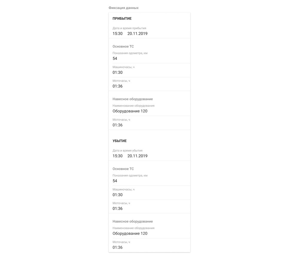 Когда Водитель приступает к работе, сотрудник Заказчика вносит данные автомобиля на момент прибытия. А когда работа завершается, эти же показатели на момент убытия. В зависимости от этапа работ, Водитель на экране видит то, что уже заполнено.