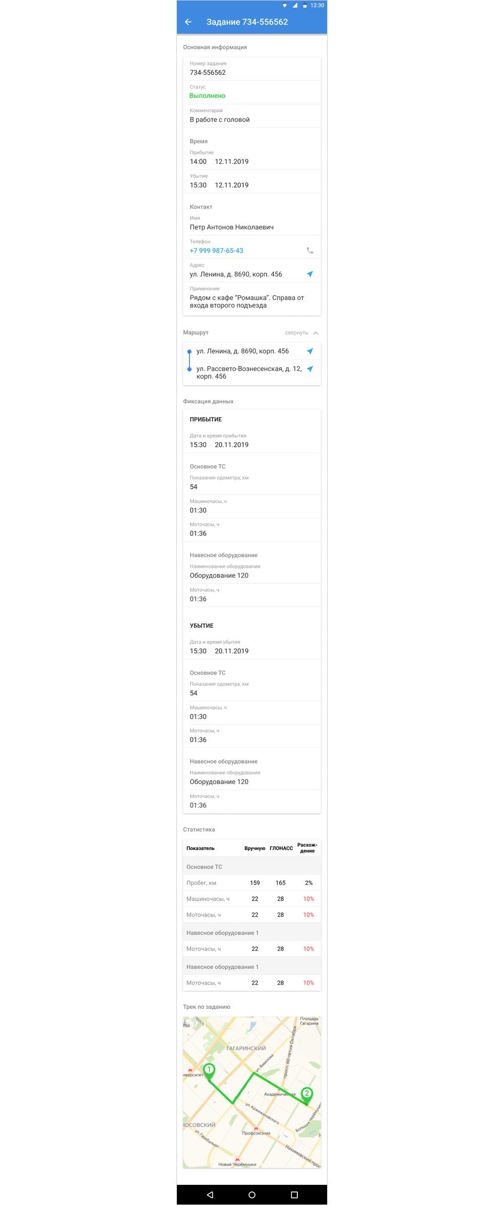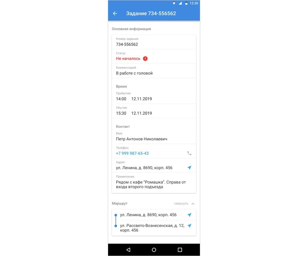 Водитель ТС видит основную информацию по заданию: номер, дату и время начала работ, адрес, контакты ответственного сотрудника, маршрут, если работа предполагает дополнительные передвижения. Для построения пути до нужной точки происходит переход в Яндекс.Навигатор.