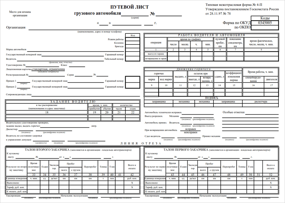 Далее, АТП назначает транспортное средство (ТС) и водителя на заявку — при этом ему выдается сформированный Путевой лист. В этот лист нужно внести данные о состоянии транспорта (пробег, машиночасы, моточасы) при выезде из гаража, при прибытии на место выполнения заявки, затем при убытии с места работы и при возвращении обратно в гараж.