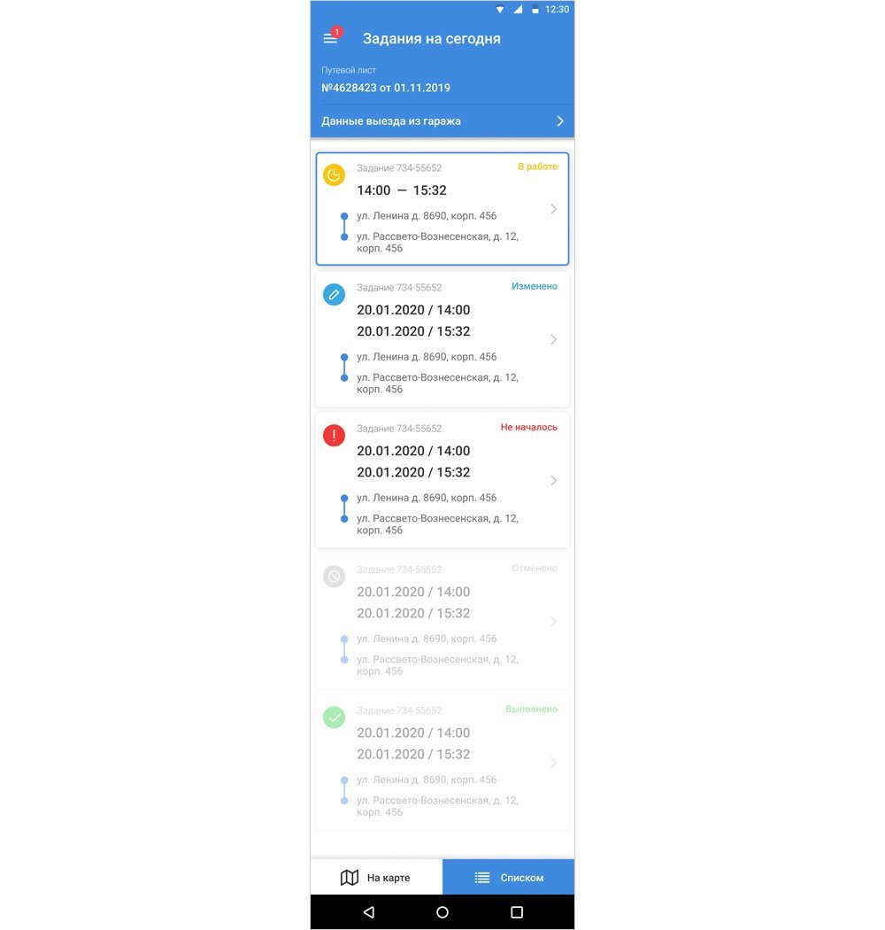 “Задания на сегодня” — основной экран работы Водителя. Наверху выводятся данные Путевого листа, ниже — список заданий. Они отображаются в хронологическом порядке, иконки помогают ориентироваться в статусах.
