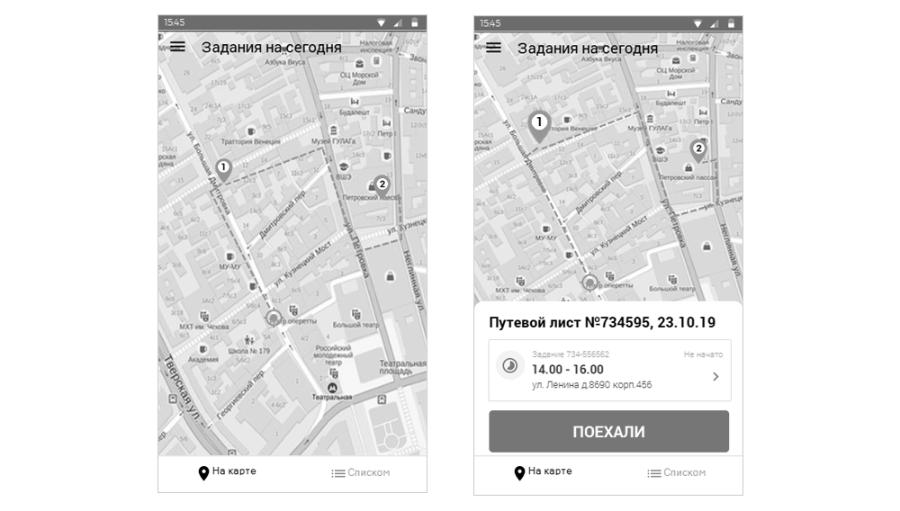Планируется сделать также второй варианта отображения — “На карте”. Те же задания будут помечены иконками на карте города, и построен маршрут между ними и внутри задания (если там несколько адресов). Сейчас реализован только вариант “Списком”.