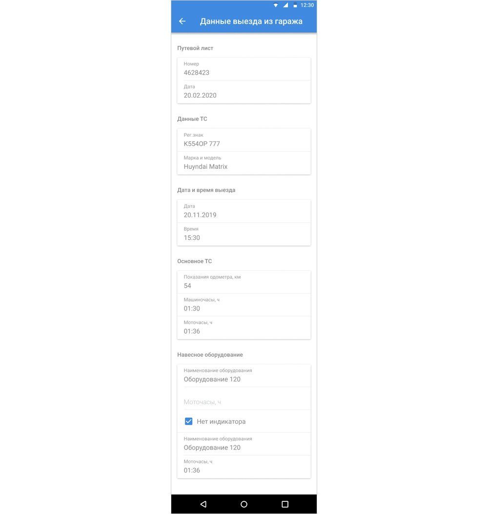 Данные выезда из гаража заполняются Пользователем — сотрудником Заказчика. Водитель может только ознакомиться с ними.