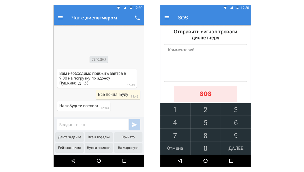 Для оперативного общения с диспетчером реализован чат. Водителю доступны несколько стандартных быстрых ответов.