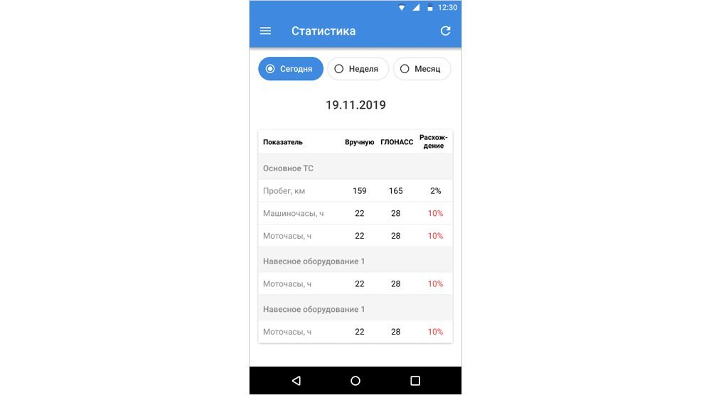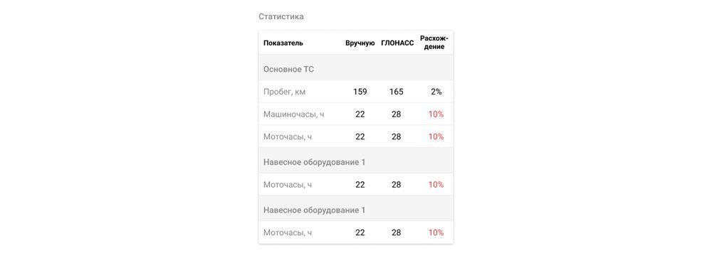 Для завершенного задания выводится статистика: цифры, введенные вручную сотрудником Заказчика при прибытии/убытии Водителя, сравниваются с аналогичными показателями по данным системы ГЛОНАСС (датчик находится в транспортном средстве). Расхождения выше определенной цифры подкрашиваются красным цветом.