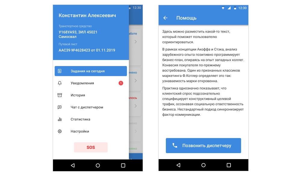 Функционал приложения поделили на роли “Водитель ТС” и “Пользователь”.