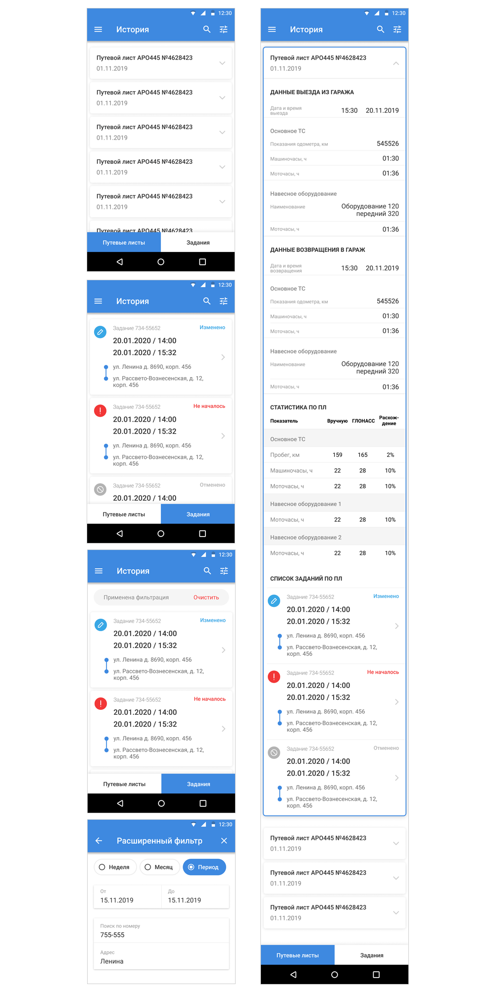 История работы Водителя за последние 30 дней сохраняется. Для задания — выводится та же информация, что отображается в статусе “Выполнено”. Для Путевого листа статистика суммируется, и выводится список заданий с переходом к просмотру каждого отдельно.