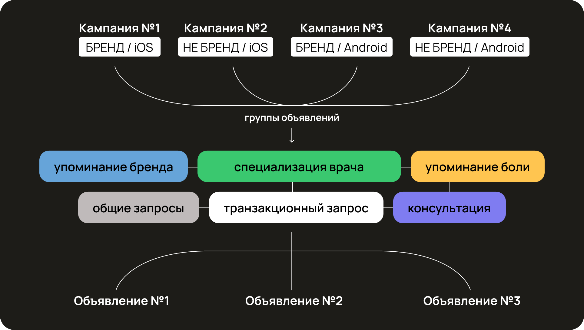 Итого у нас получилось 4 рекламные кампании. Их поделили по типу запросов (брендовые и небрендовые), а также по типу самых популярных операционных систем (iOS, Android).