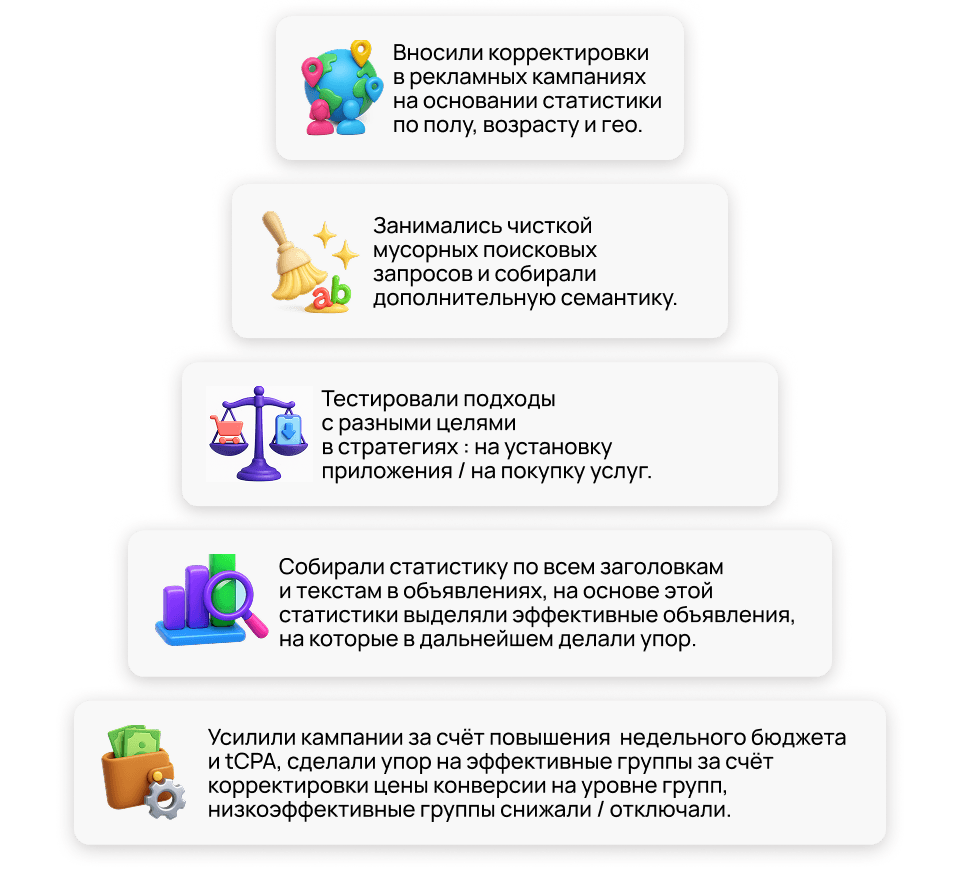 Изначально компания обратилась с общей целью — продвижение услуг сервиса. В ходе консультаций мы смогли вскрыть ограничения и барьеры, найти оптимальное решение для клиента и поставить конкретную цель в цифрах.