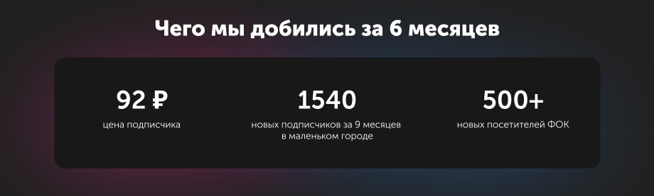 Стоимость подписчика составила 92 ₽. Это значительно ниже рыночной стоимости — в среднем подписка сейчас выходит в 200−250 ₽. Особенно с учетом размера города и небольшого населения, что обычно значительно удорожает рекламу.