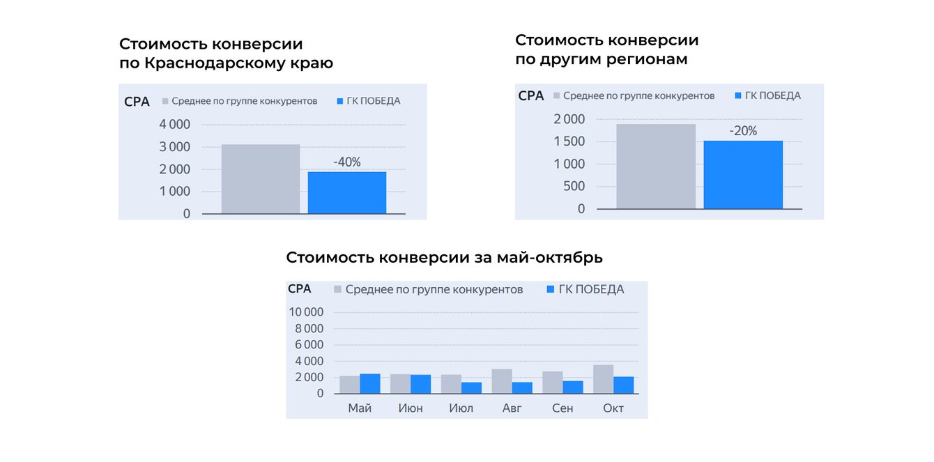 По данному исследованию стоимость конверсии у нашей рекламной кампании за период сентябрь-октябрь была на 40% ниже, чем у конкурентов (на Поиске конверсии стоили дешевле на 43%, в сетях — на 35%).