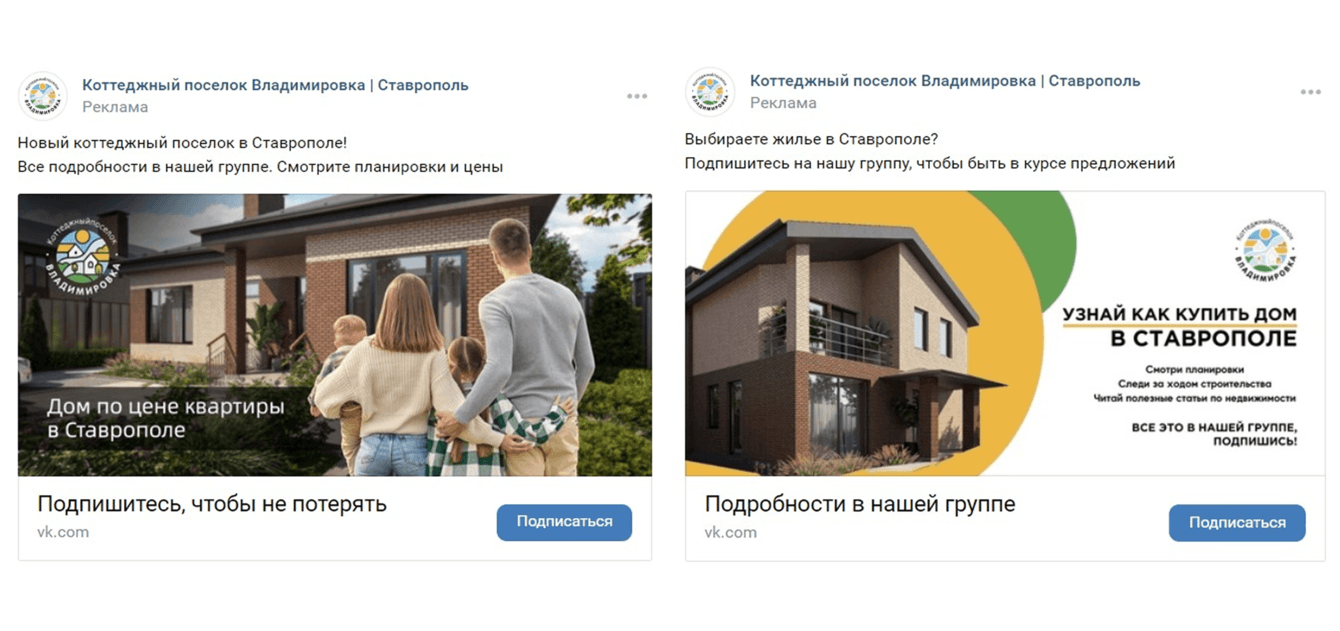 Целью таргетированной рекламы было увеличение подписчиков и активности в сообществе коттеджного поселка «Владимировка» во Вконтакте.