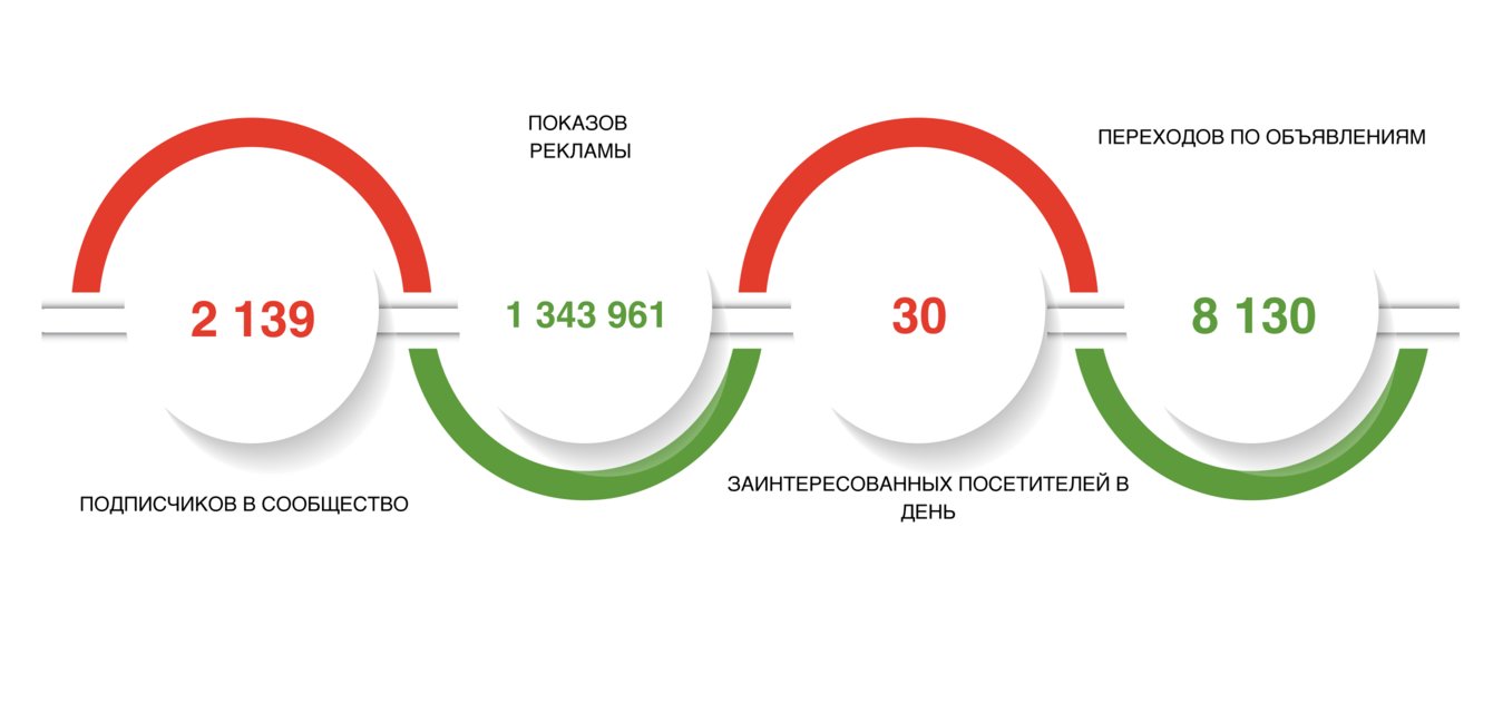 В результате за 9 месяцев работы реклама была показана 1 343 961 раз, получено 8 130 кликов, то есть в среднем ежедневно сообщество коттеджного поселка посещало 30 заинтересованных человек с таргетированной рекламы. С помощью рекламы мы привели 2 139 подписчиков в сообщество «КП Владимировка» в Вконтакте.