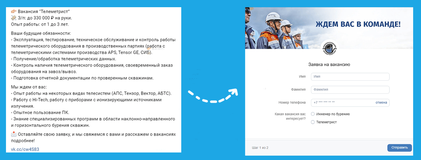 - Чтобы повысить конверсию, максимально сократили путь соискателя и создали короткую лид-форму с автоматическим сбором данных без выхода за пределы соцсети.