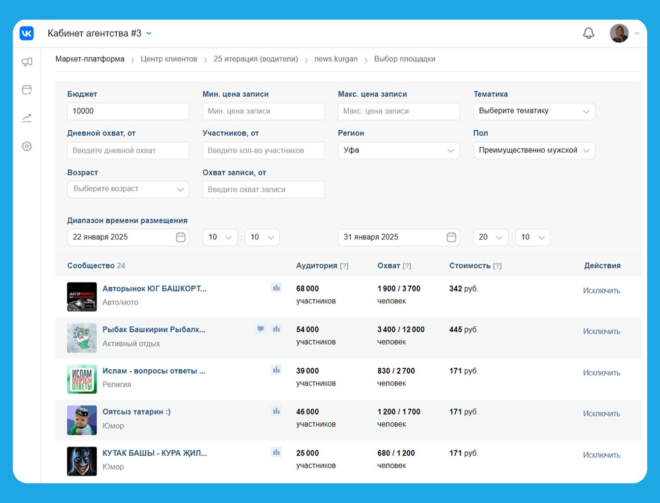 Просмотрели более 200 сообществ по 17 городам. Проанализировали статистику сообществ (число просмотров, количество лайков и комментариев), после этого сузили выборку и составили медиаплан по размещению в 24 сообществах – чтобы вписаться в рамки бюджета клиента.